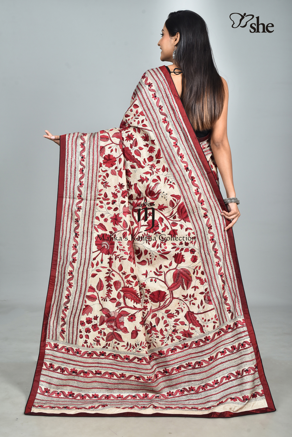 BEIGE TUSSAR KANTHA EMBROIDERED SAREE WITH RED TREE OF LIFE. BLOUSE INCLUDED.