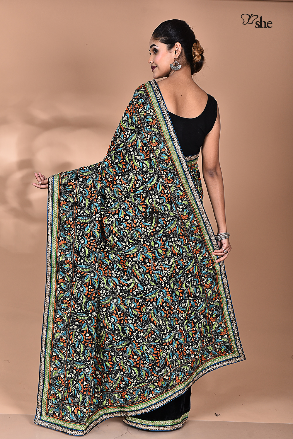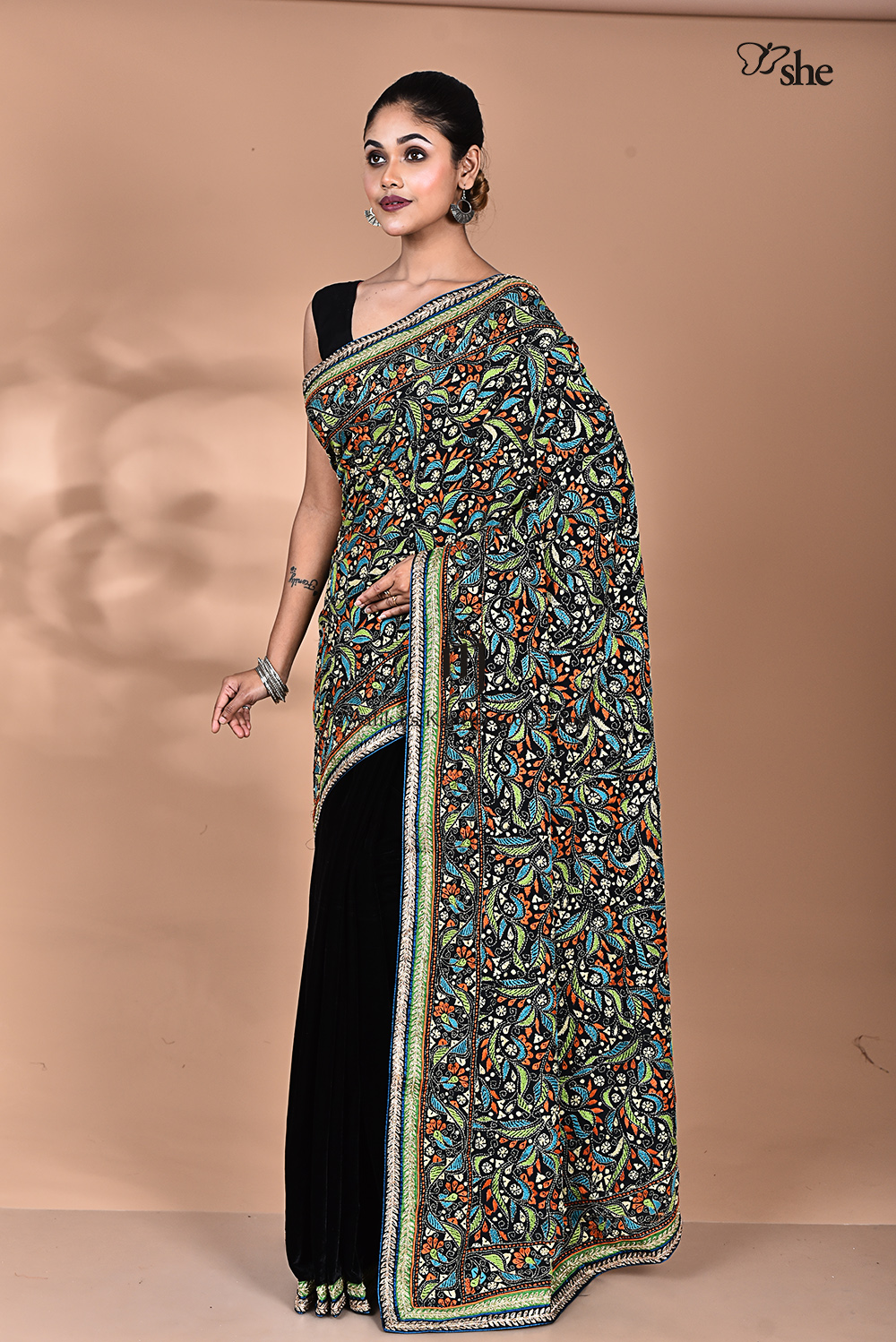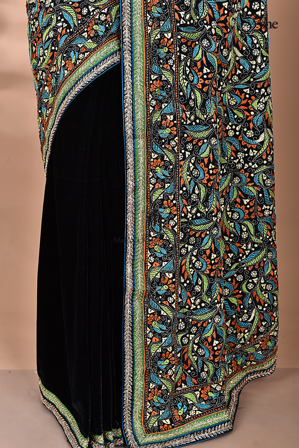 BLACK CREPE AND VELVET KANTHA MINAKARI EMBROIDERED SAREE. EMBELLISHED WITH ZARDOZI WORK. Blouse PIECE INCLUDED.