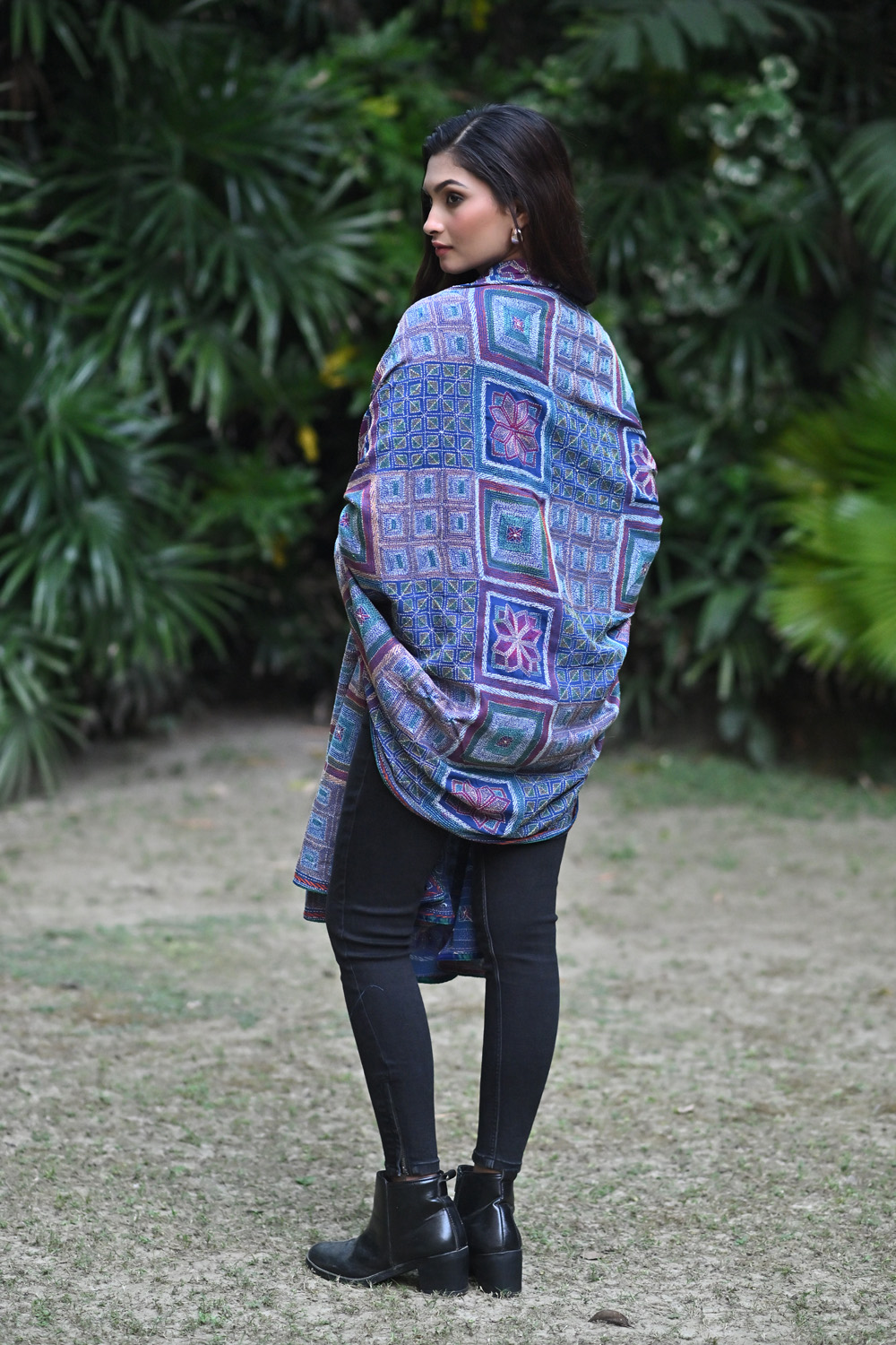 BLUE CREPE KANTHA EMBROIDERED DUPATTA WITH GEOMETRICAL DESIGN.