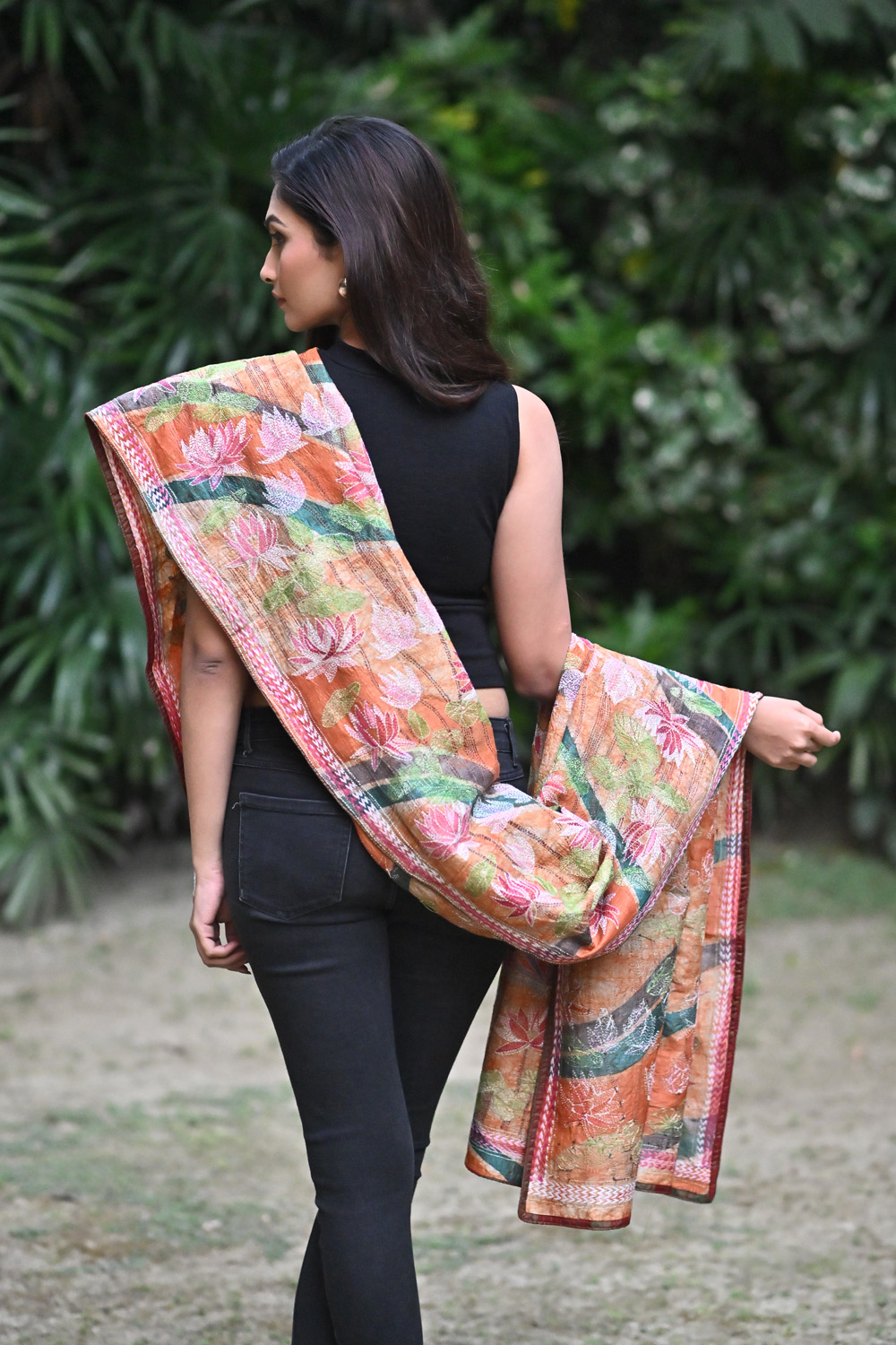 ORANGE TUSSAR TYE & DYE KANTHA EMBROIDERED DUPATTA WITH LOTUS JAAL DESIGN.
