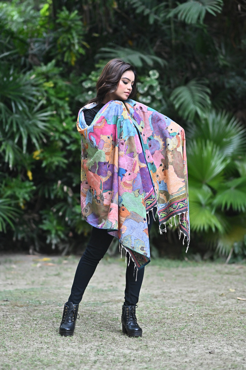 MULTICOLOR TUSSAR KANTHA EMBROIDERED DUPATTA WITH COW DESIGN.