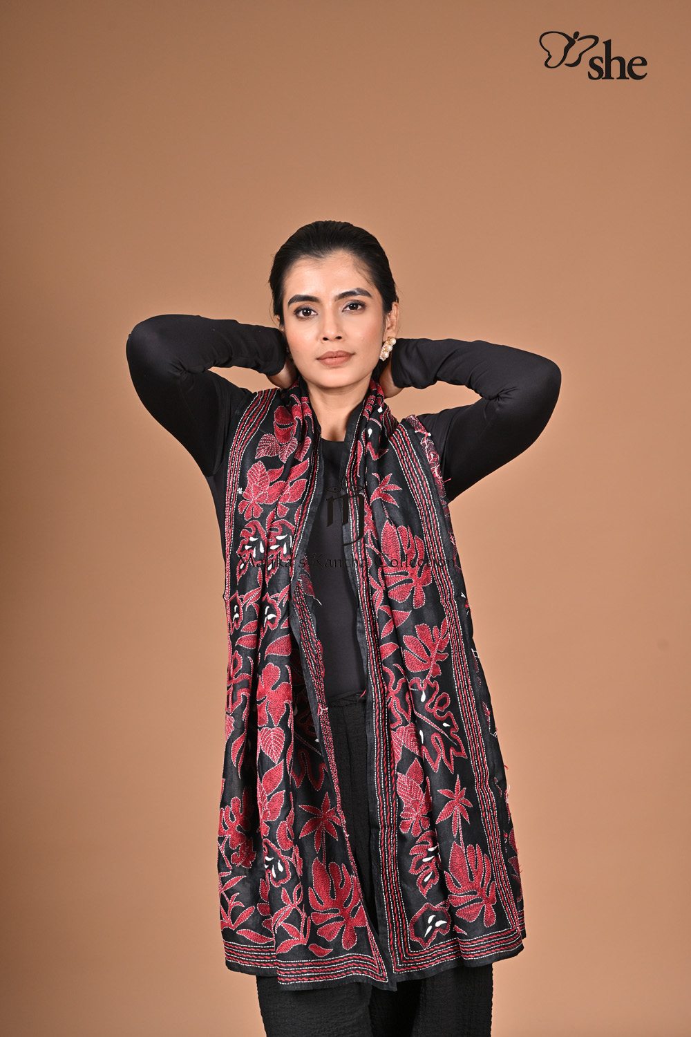 BLACK TUSSAR KANTHA EMBROIDERED WITH RED & WHITE OUTLINED LEAF & FLORAL BUTI JAAL DESIGN.