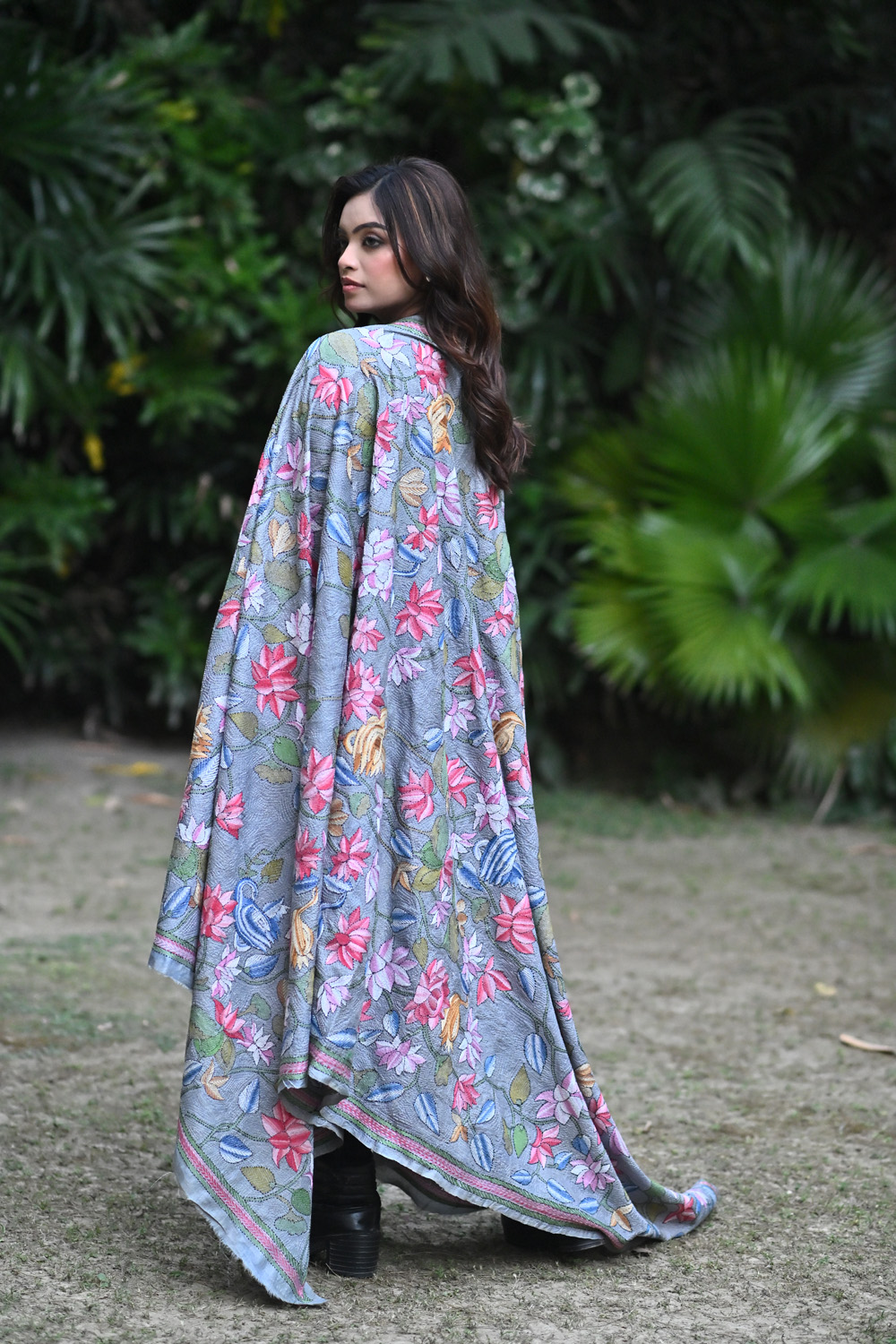 GREY TUSSAR KANTHA EMBROIDERED DUPATTA WITH SWAN & LOTUS JAAL DESIGN.