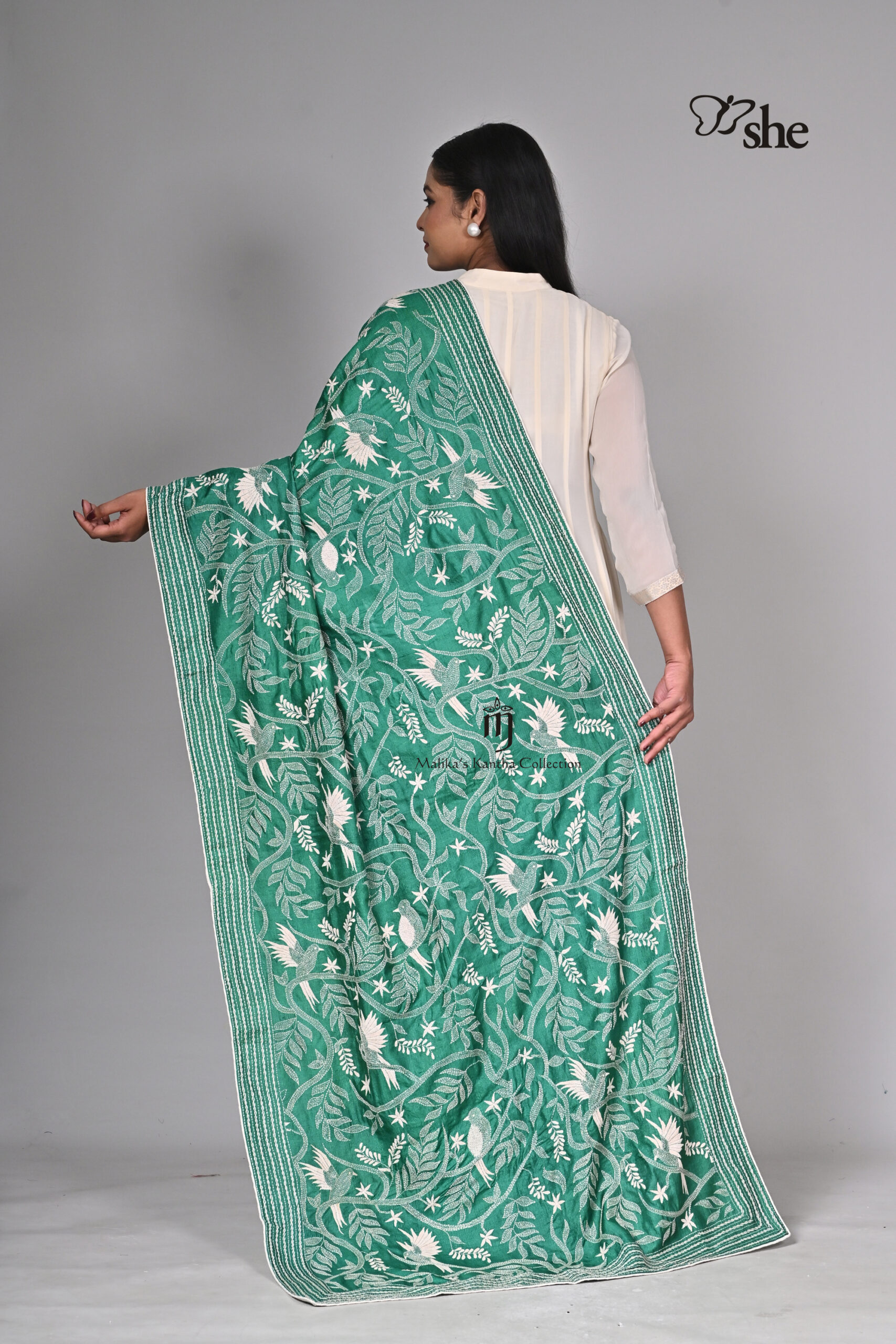 GREEN TUSSAR KANTHA EMBROIDERED DUPATTA WITH BIRDS ON TREE & FLORAL BUTI DESIGN.
