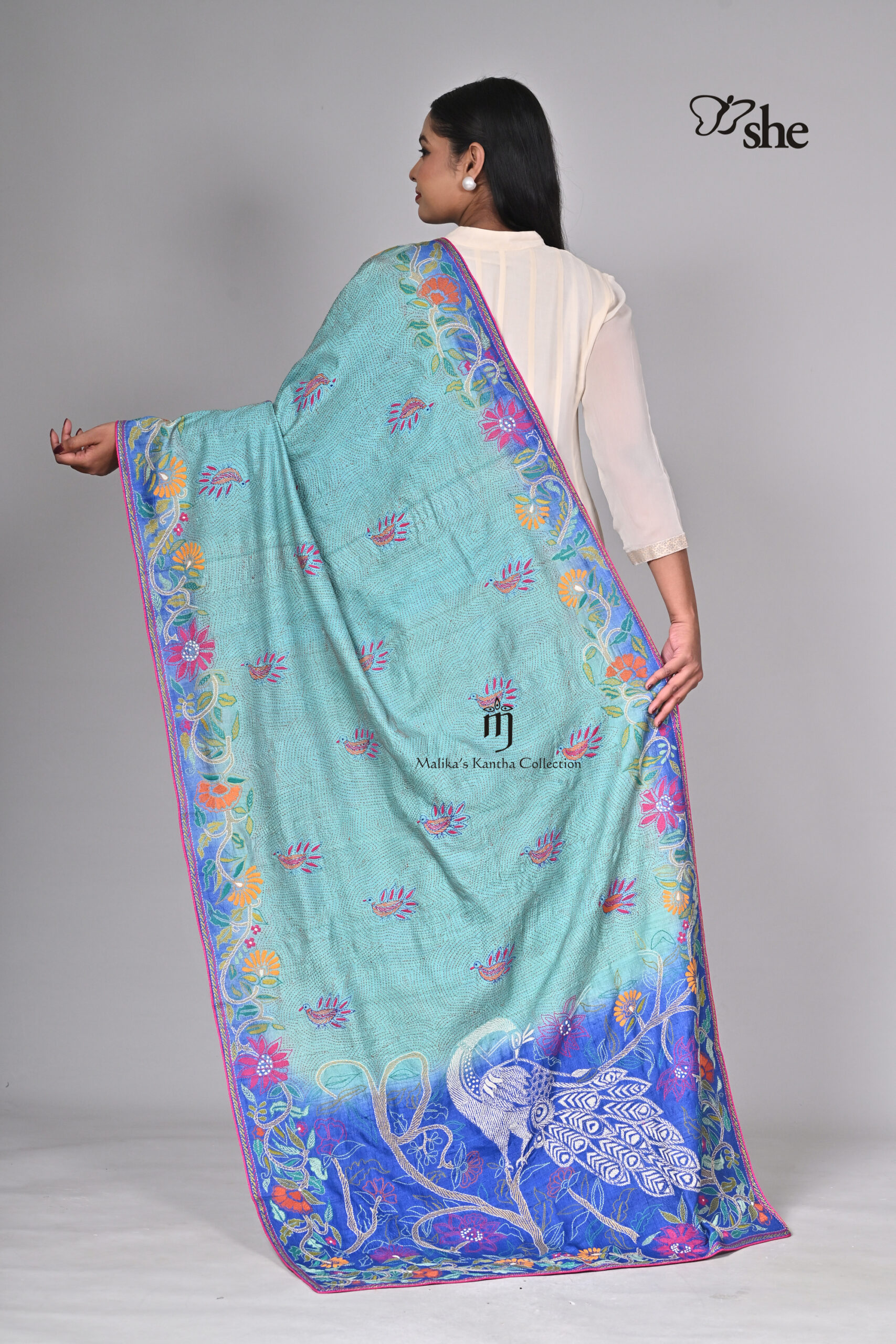GREEN & BLUE TUSSAR KANTHA EMBROIDERED DUPATTA WITH PEACOCK DESIGN.