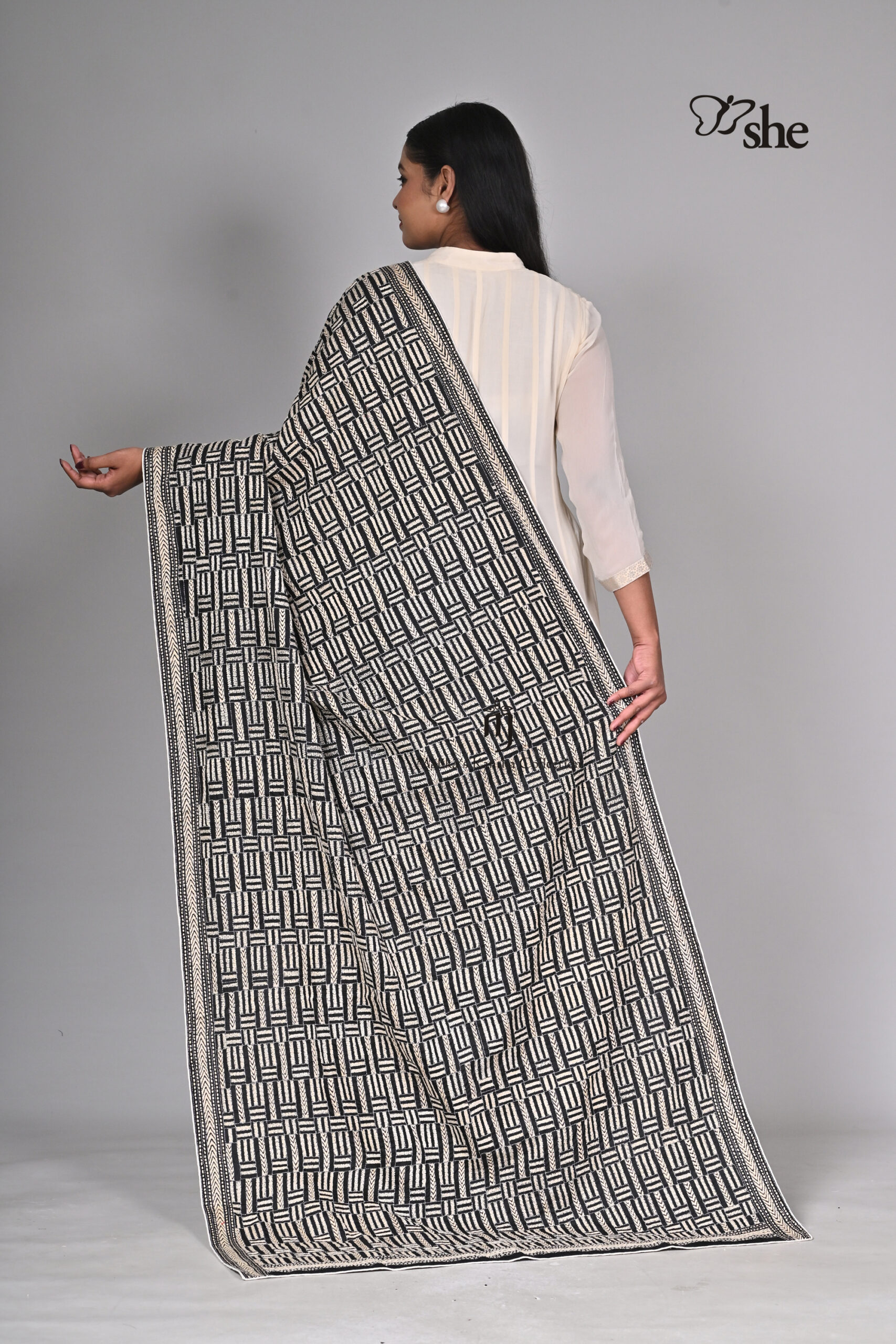 BLACK SILK KANTHA EMBROIDERED DUPATTA WITH BEIGE BRICK DESIGN.
