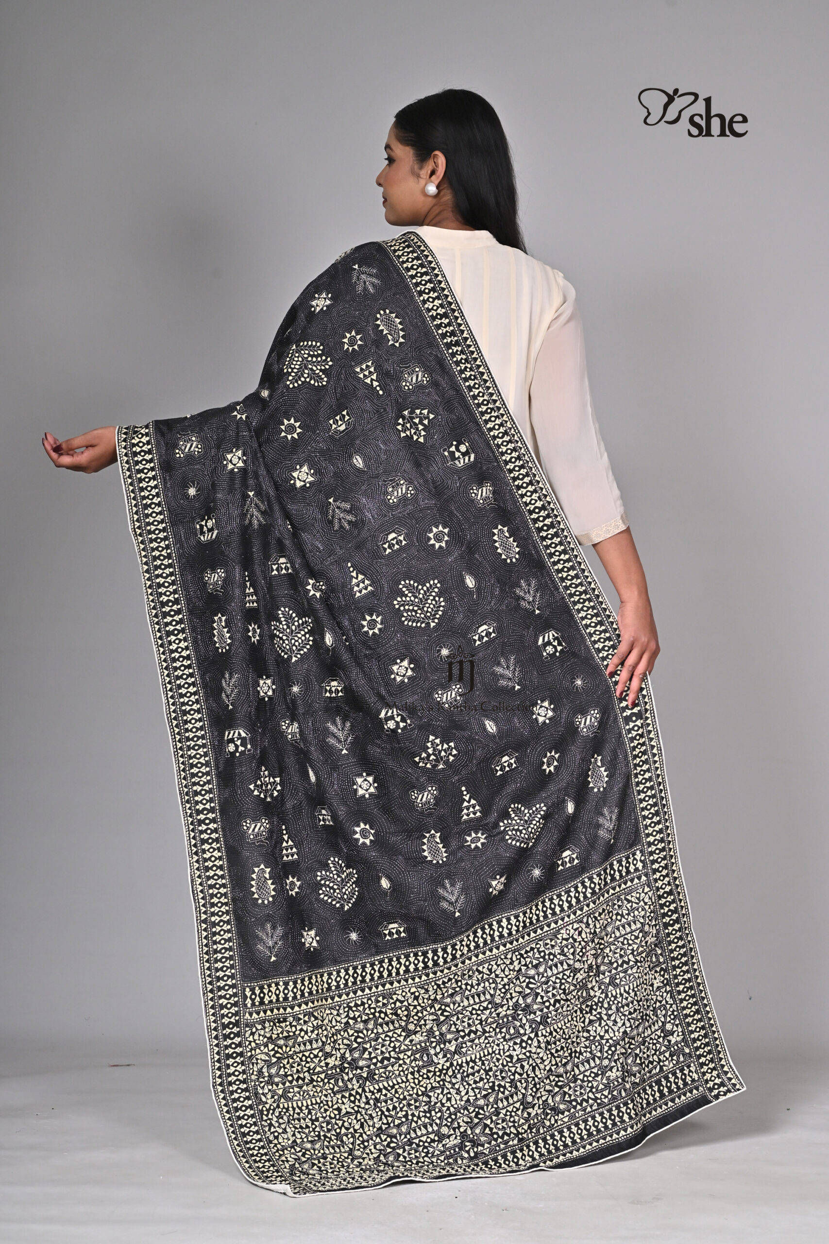 BLACK SILK KANTHA EMBROIDERED DUPATTA WITH CREAM WARLI DESIGN.