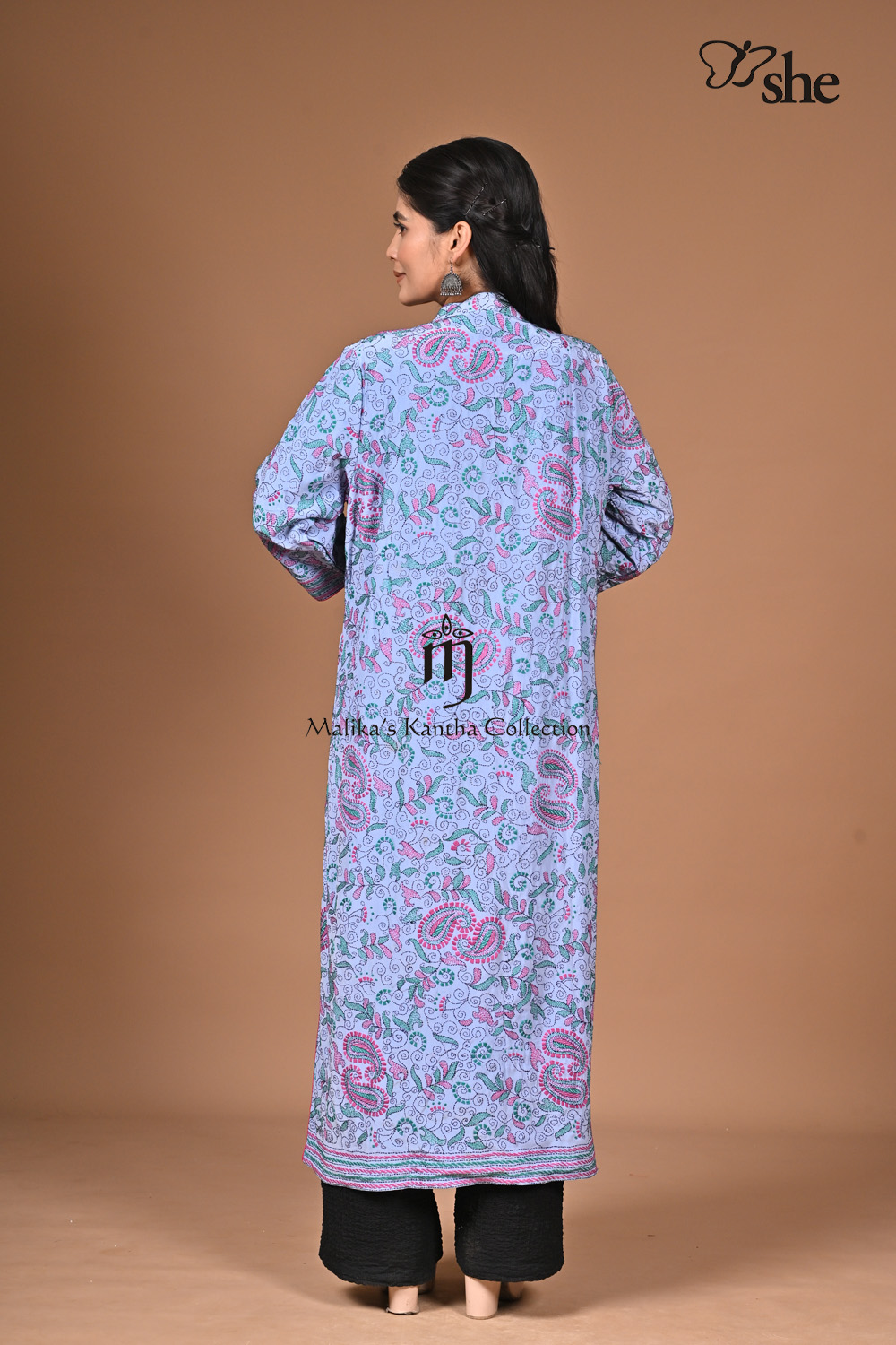 BLUE CREPE KANTHA EMBROIDERED KURTA WITH PINK & GREEN JORA KALGA.
