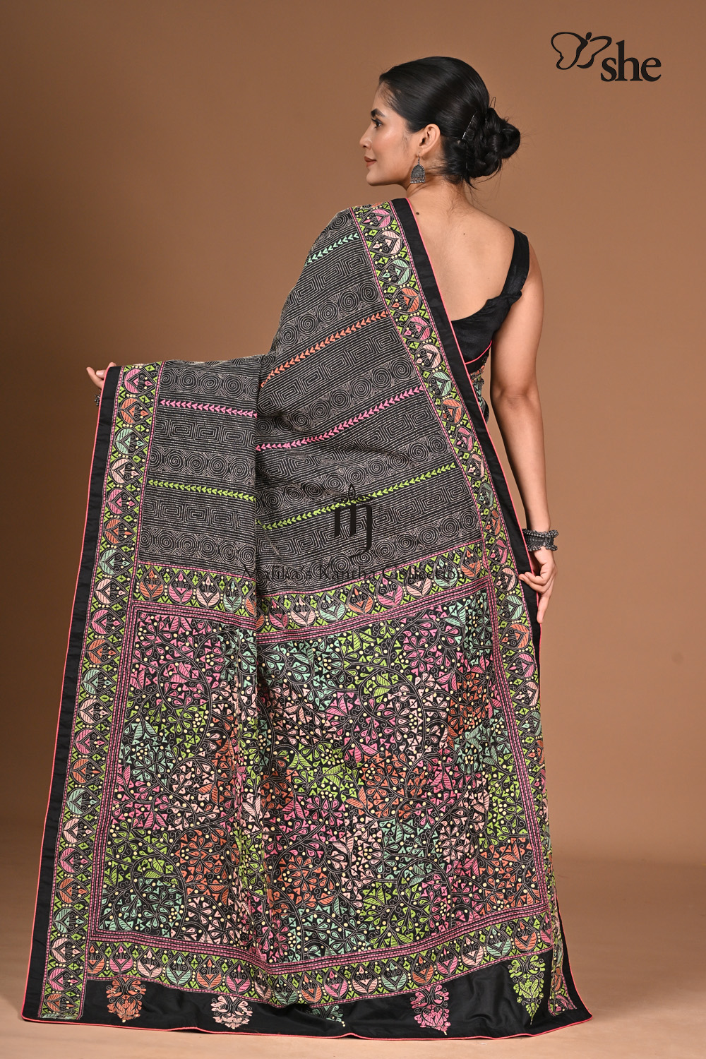 BLACK SILK KANTHA EMBROIDERED SAREE WITH MULTICOLORED GEOMETRIC LINE DESIGN . BLOUSE INCLUDED.