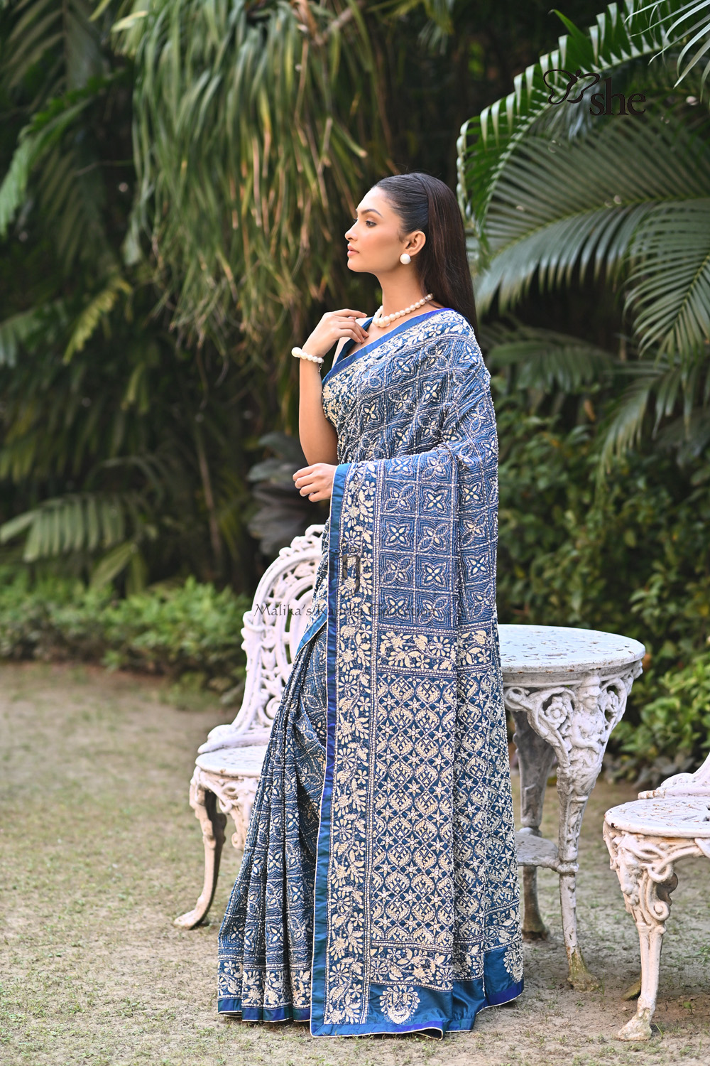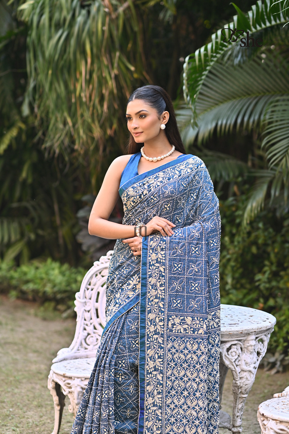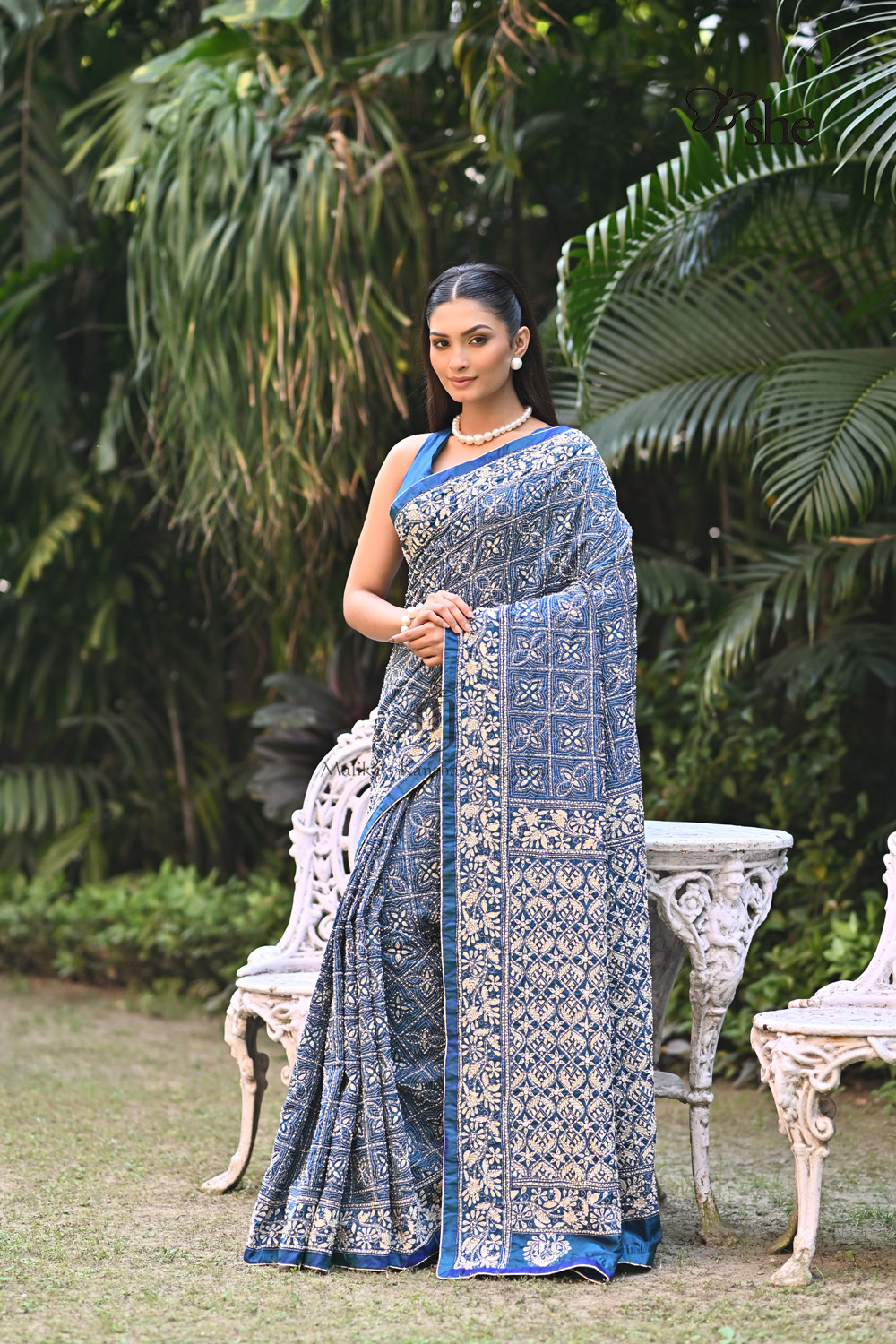 BLUE SILK KANTHA EMBROIDERED & BEADED SAREE WITH FOUR PETAL FLOWER DESIGN . BLOUSE INCLUDED.