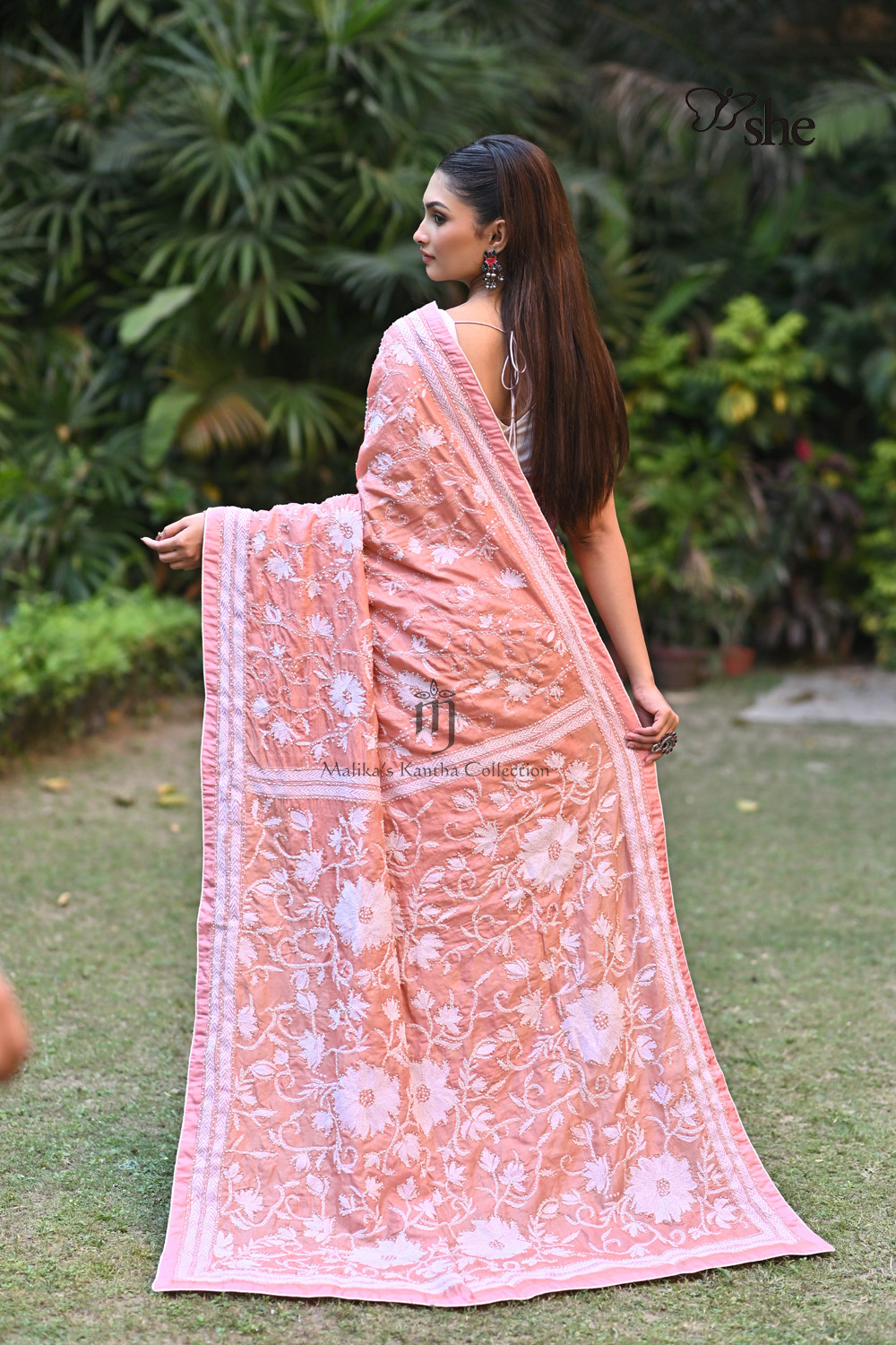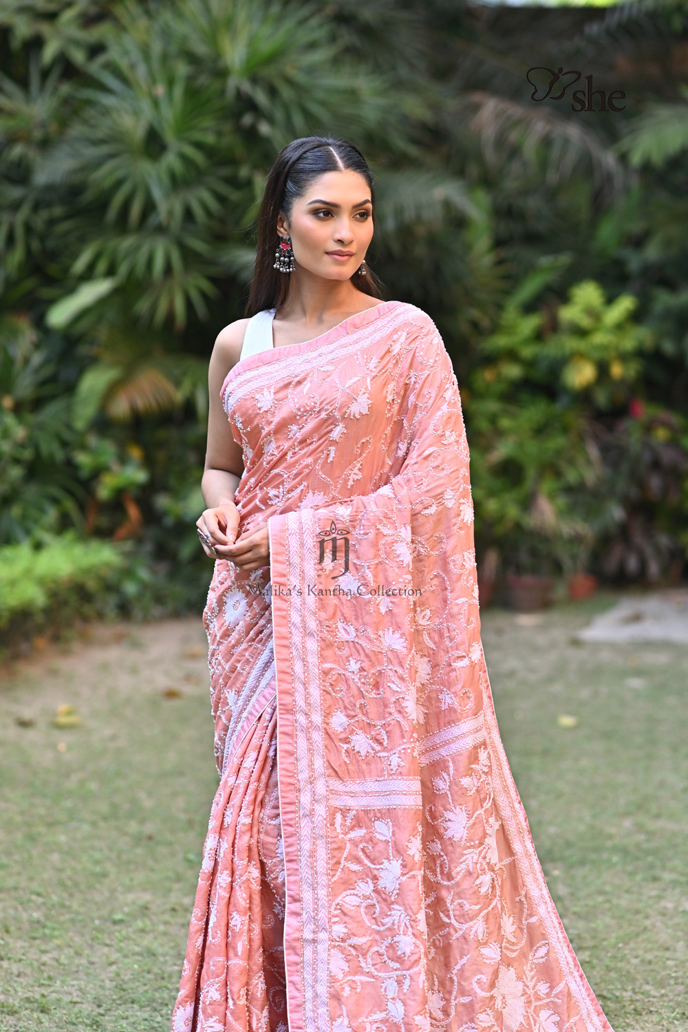 PINK TUSSAR KANTHA EMBROIDERED & BEADED SAREE WITH CHRYSANTHEMUM JAAL ALL OVER DESIGN . BLOUSE INCLUDED.