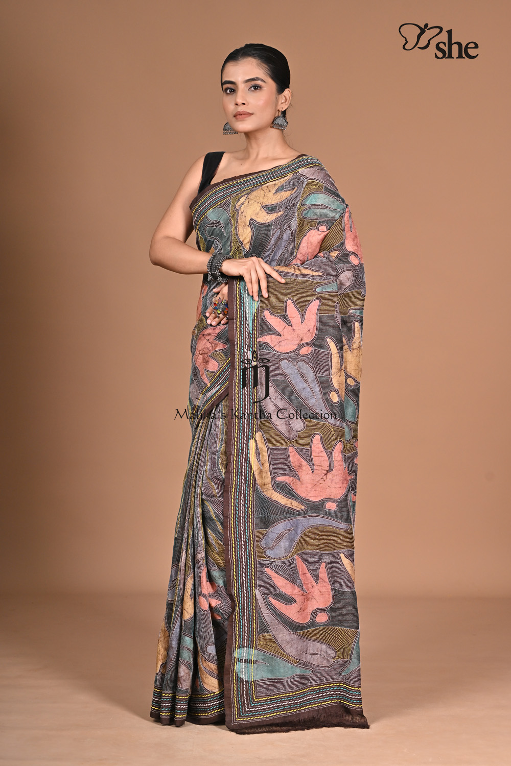 BROWN TUSSAR KANTHA EMBROIDERED SAREE WITH BATIK FLORAL BUTI & LINEAR DESIGN. BLOUSE INCLUDED.