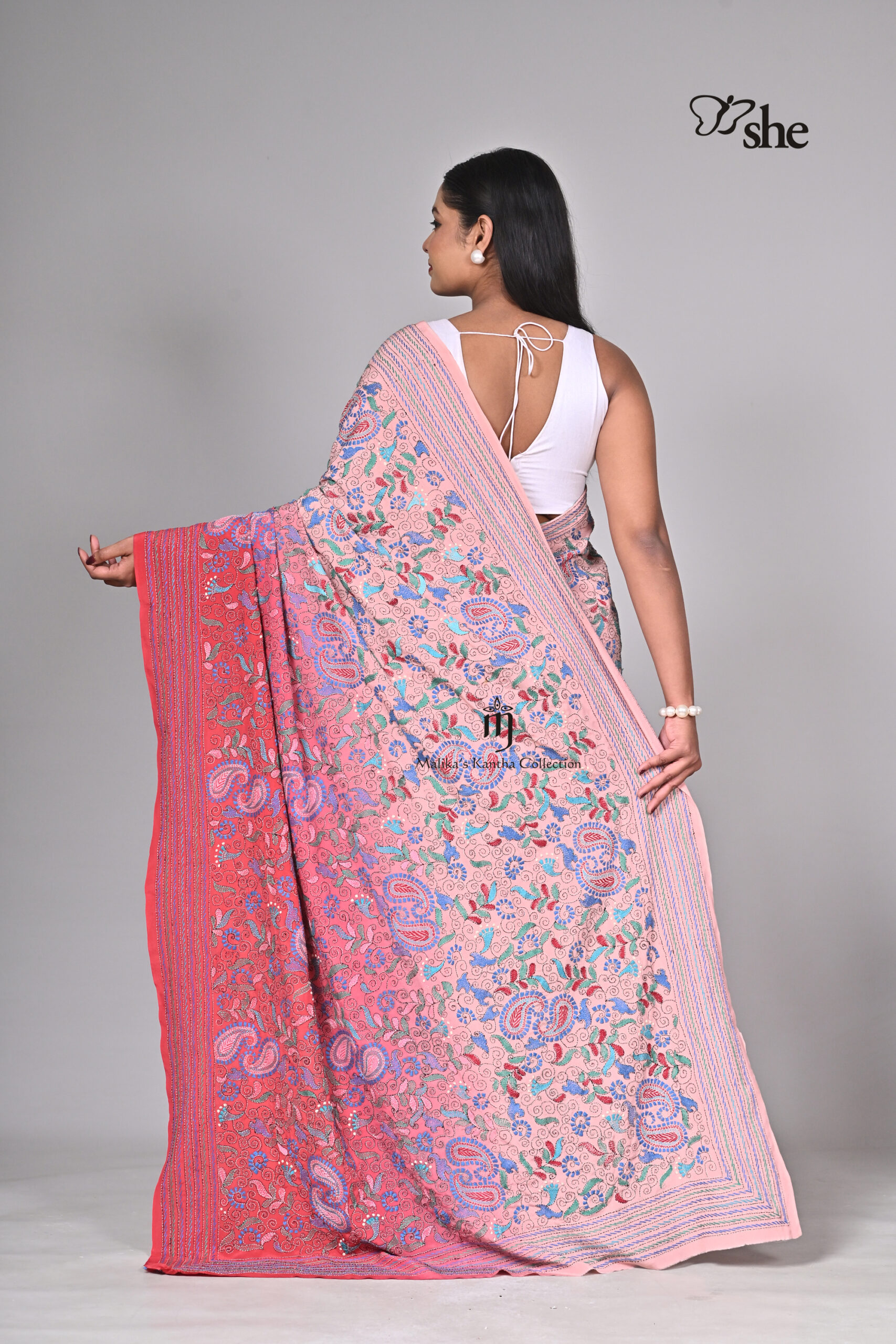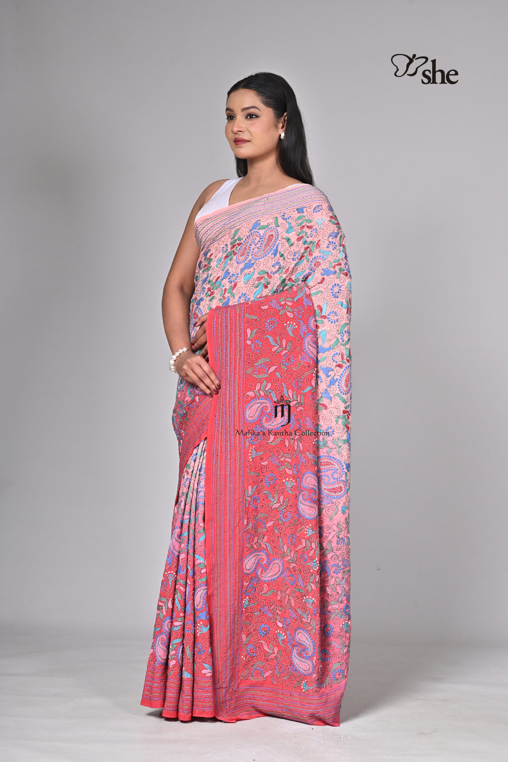 RED & PINK OMBRE SHADED CREPE KANTHA EMBROIDERED SAREE WITH MULTICOLOURED JORA KALGA JAAL ALL OVER DESIGN. BLOUSE INCLUDED.