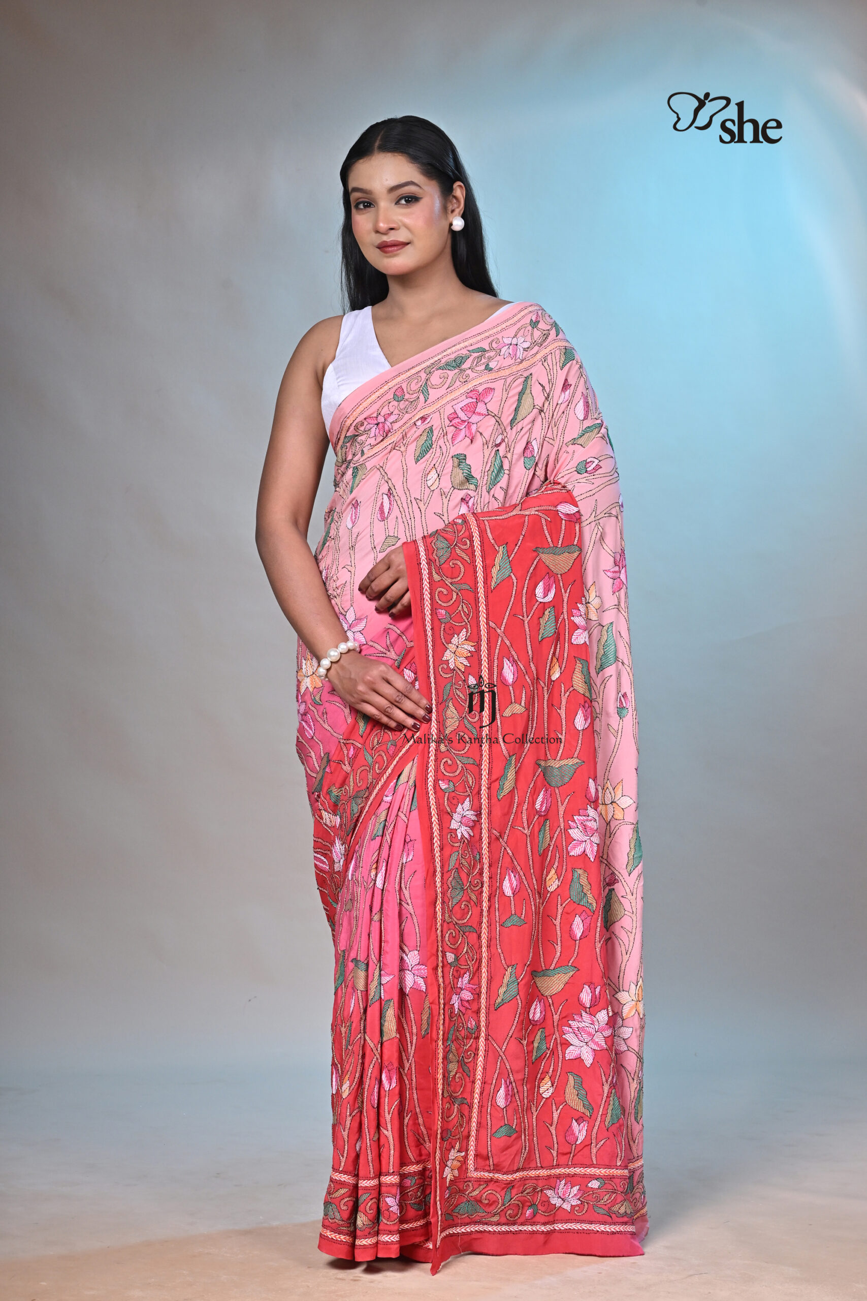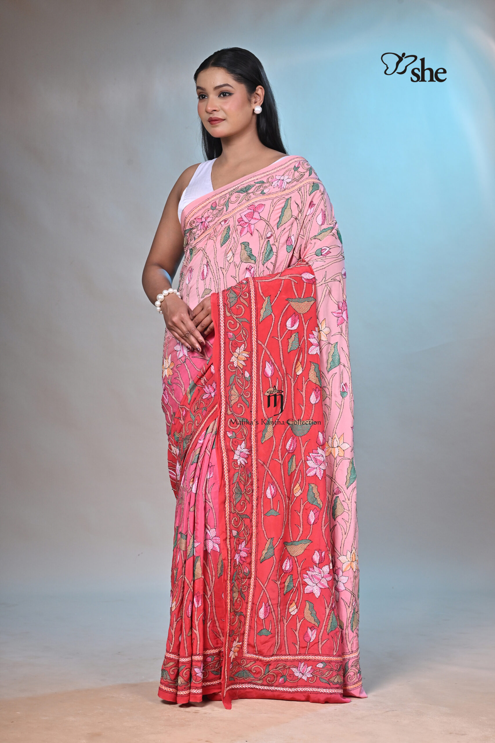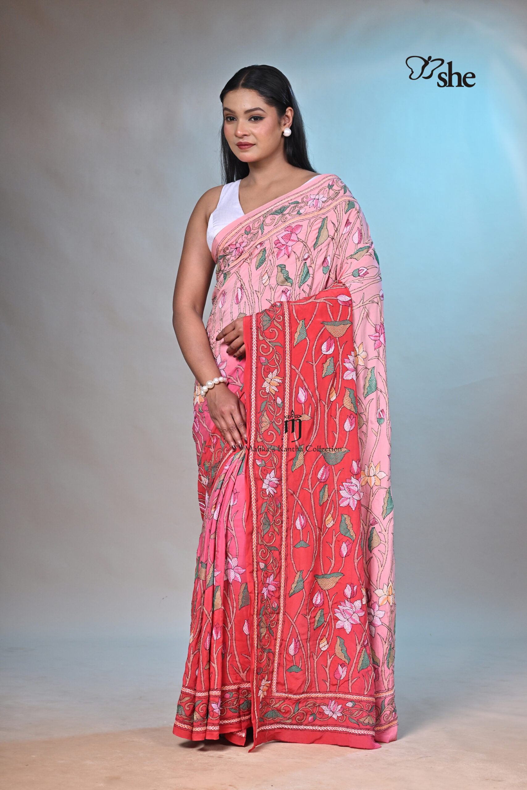 RED & PINK OMBRE SHADED CREPE KANTHA EMBROIDERED SAREE WITH MULTICOLOURED LOTUS JAAL ALL OVER DESIGN. BLOUSE INCLUDED.