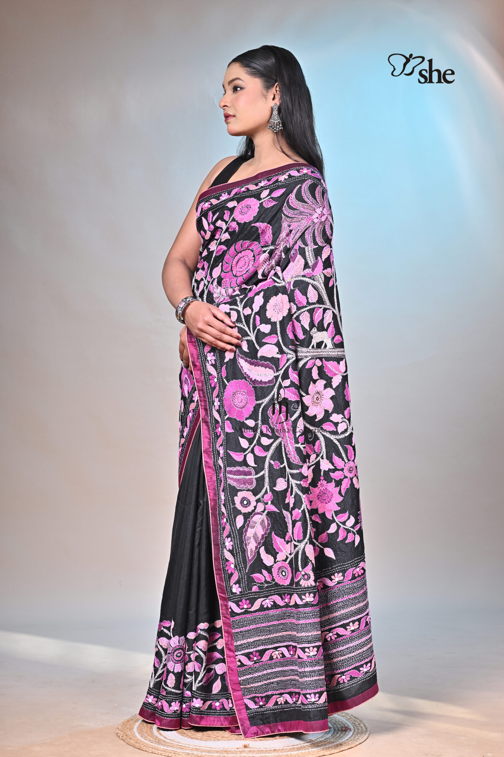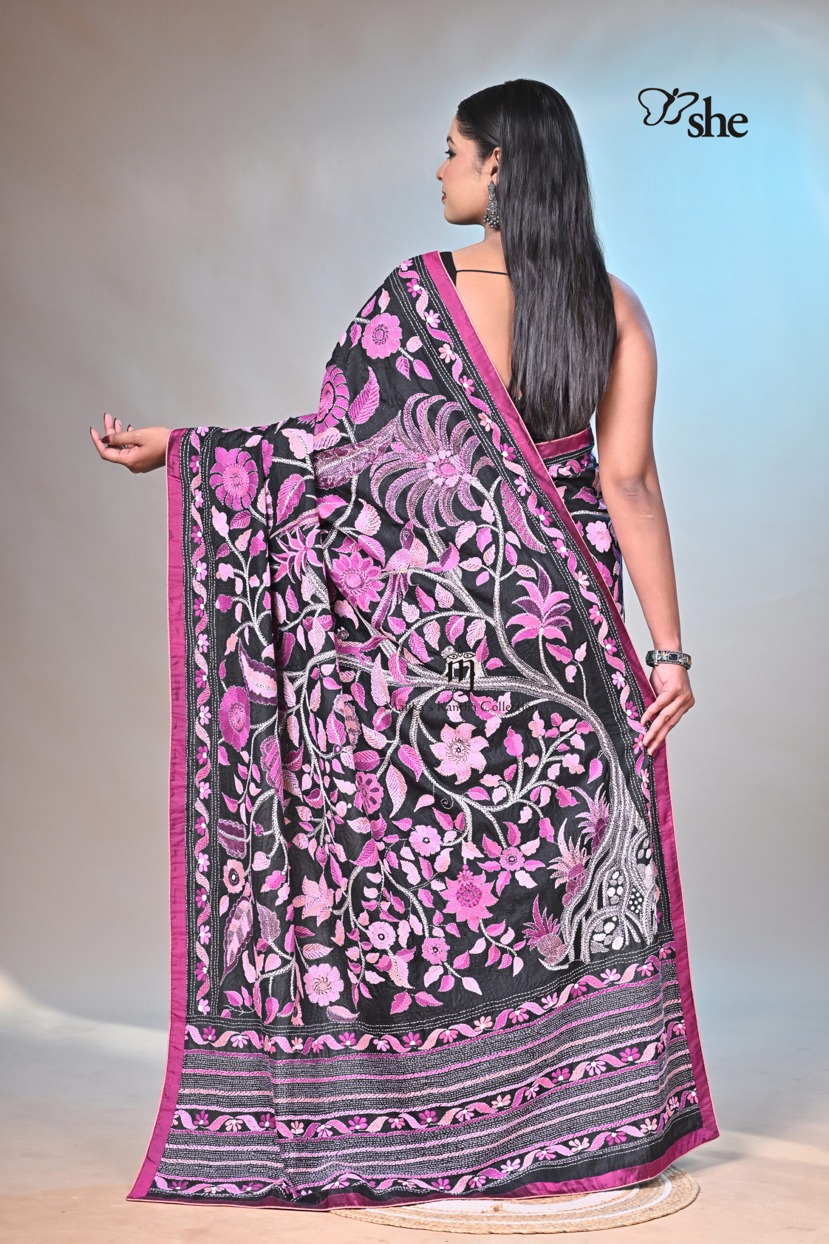BLACK SILK KANTHA EMBROIDERED SAREE WITH TREE OF LIFE AND PARROT DESIGN. BLOUSE INCLUDED.