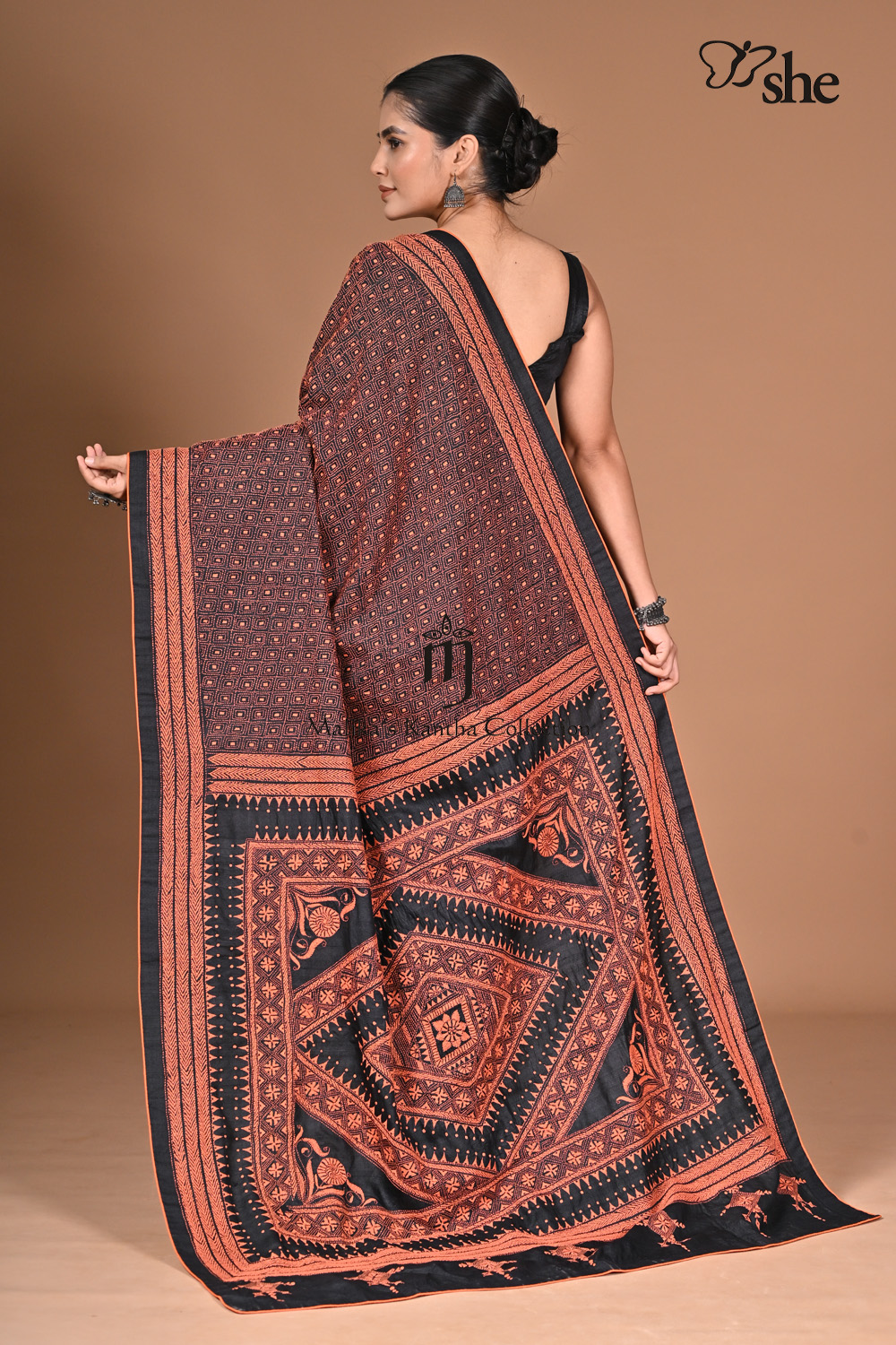 BLACK TUSSAR KANTHA EMBROIDERED SAREE WITH SMALL RUST COLORED SQUARE DESIGN. BLOUSE INCLUDED.