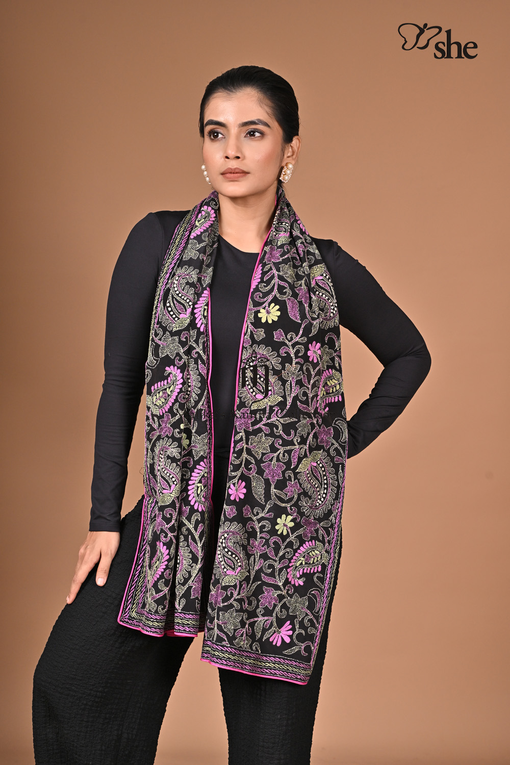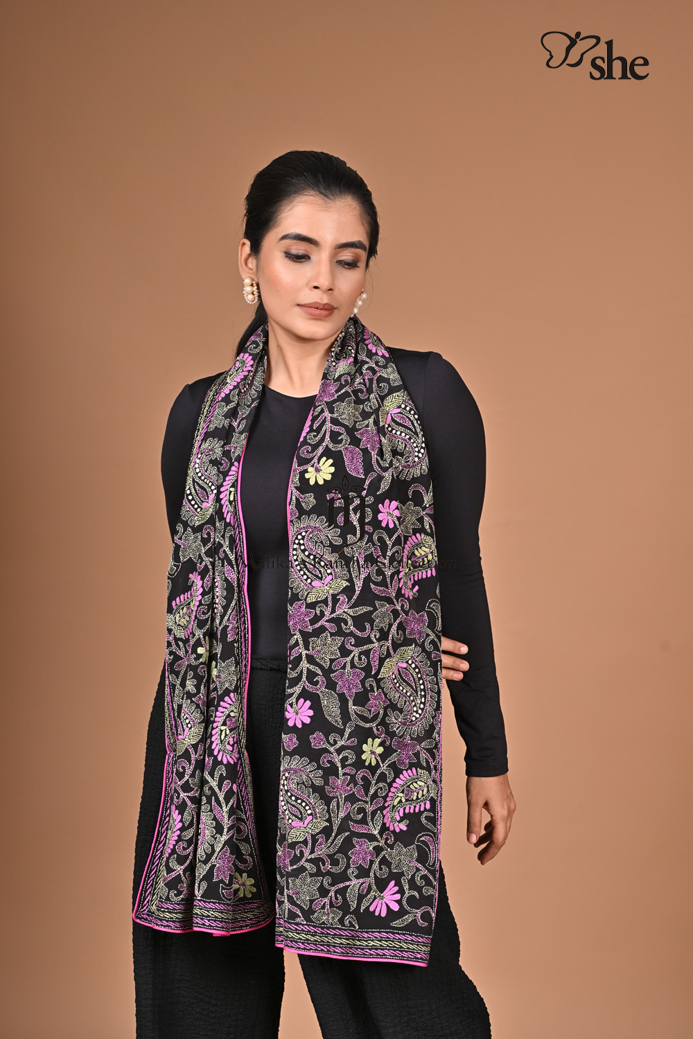 BLACK CREPE KANTHA EMBROIDERED SCARF WITH HEAVY PAISLEY JAAL DESIGN.