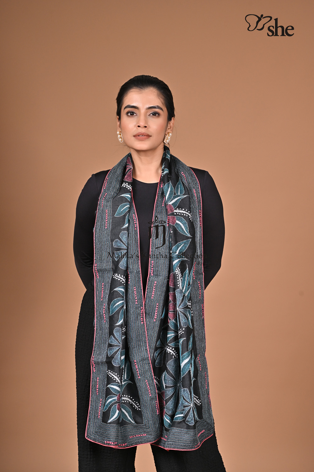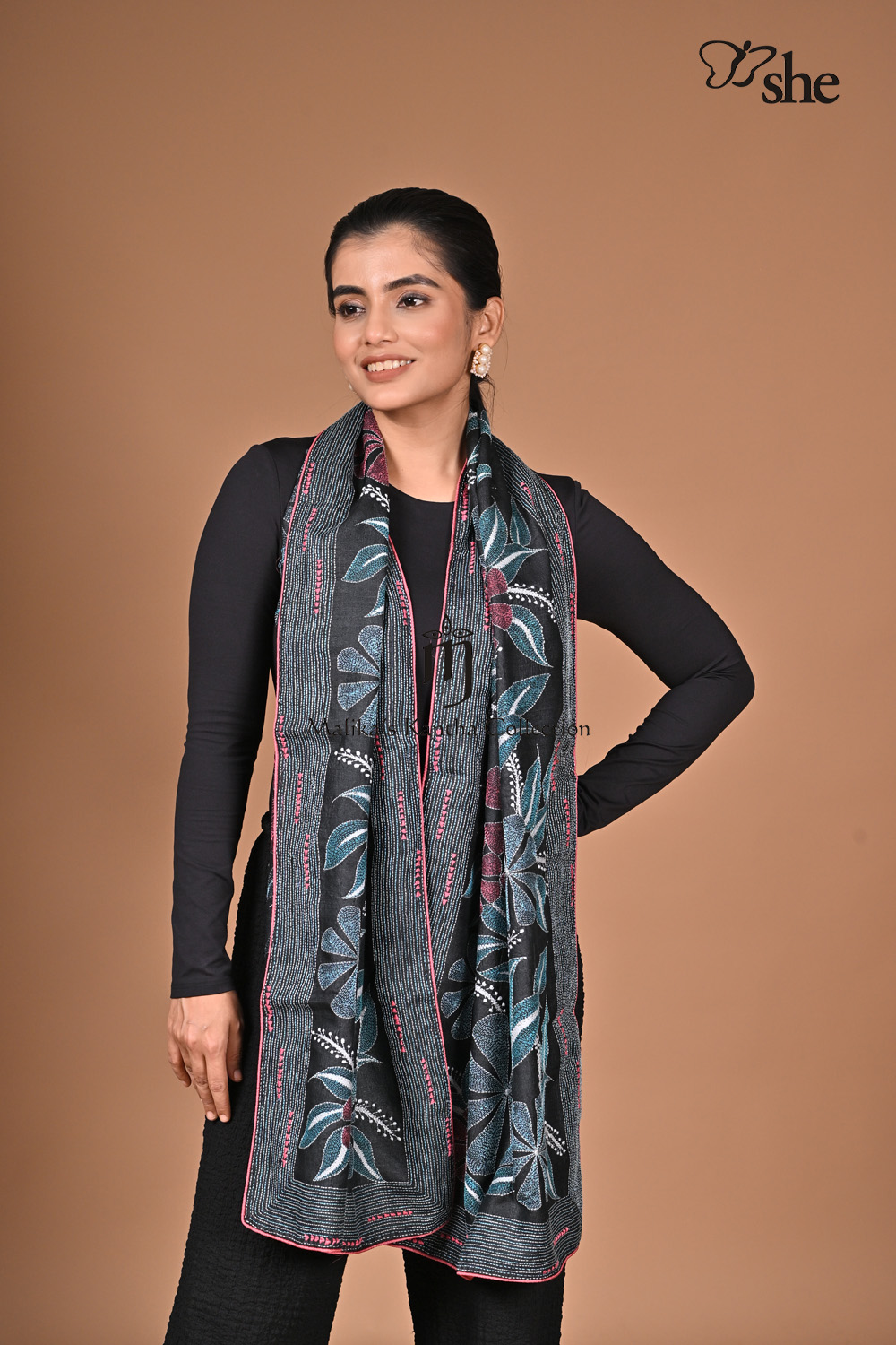BLACK TUSSAR KANTHA EMBROIDERED SCARF WITH BLUE & PINK FLORAL DESIGN.