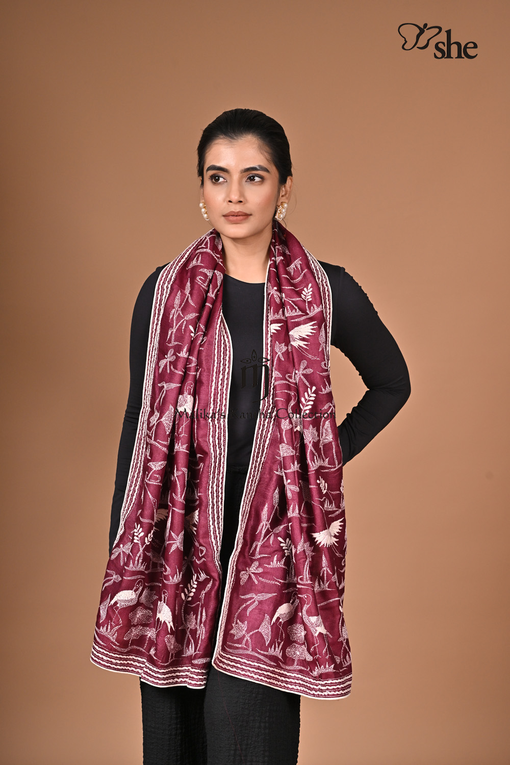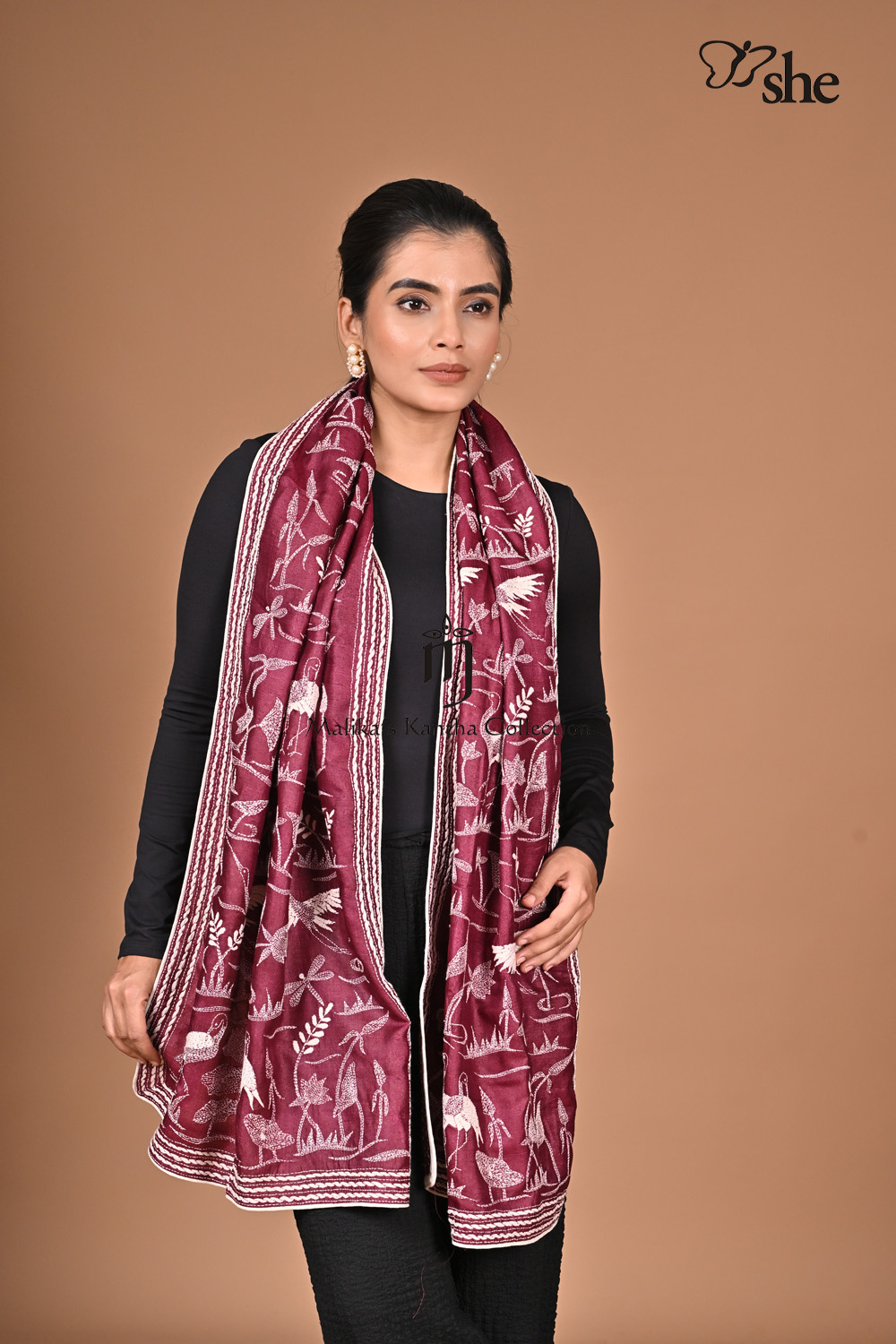 PLUM TUSSAR KANTHA EMBROIDERED SCARF WITH WHITE CRANES JAAL DESIGN.