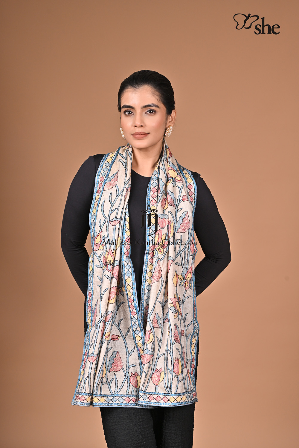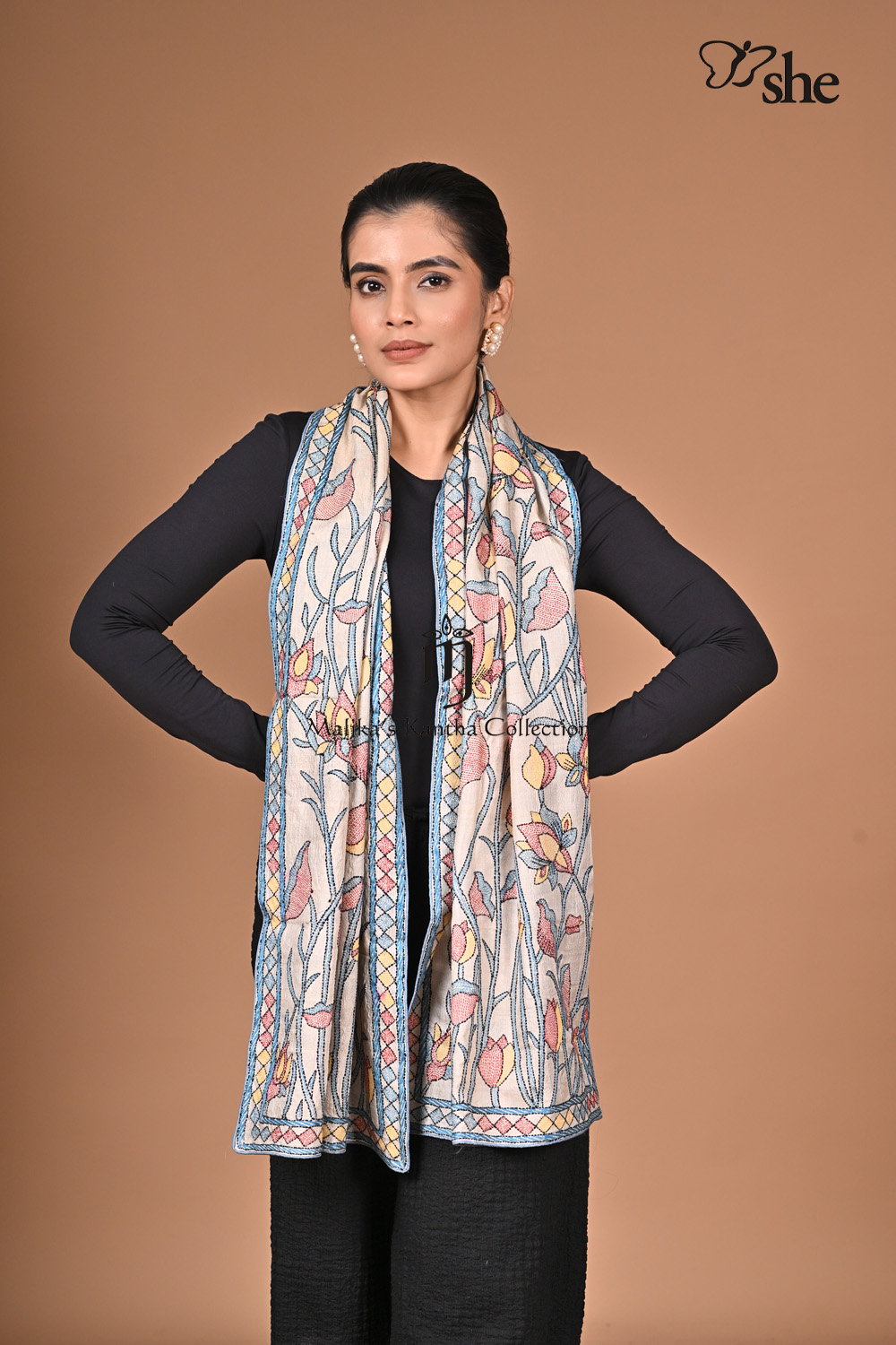 BEIGE TUSSAR KANTHA EMBROIDERED SCARF WITH MULTICOLOR LOTUS JAAL IN KALMAKARI STYLE.