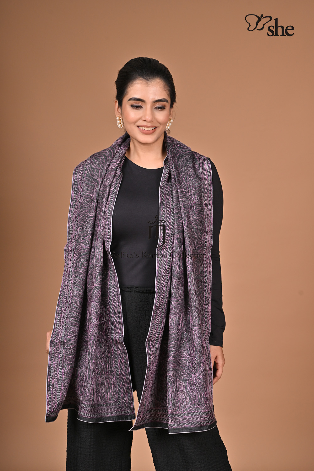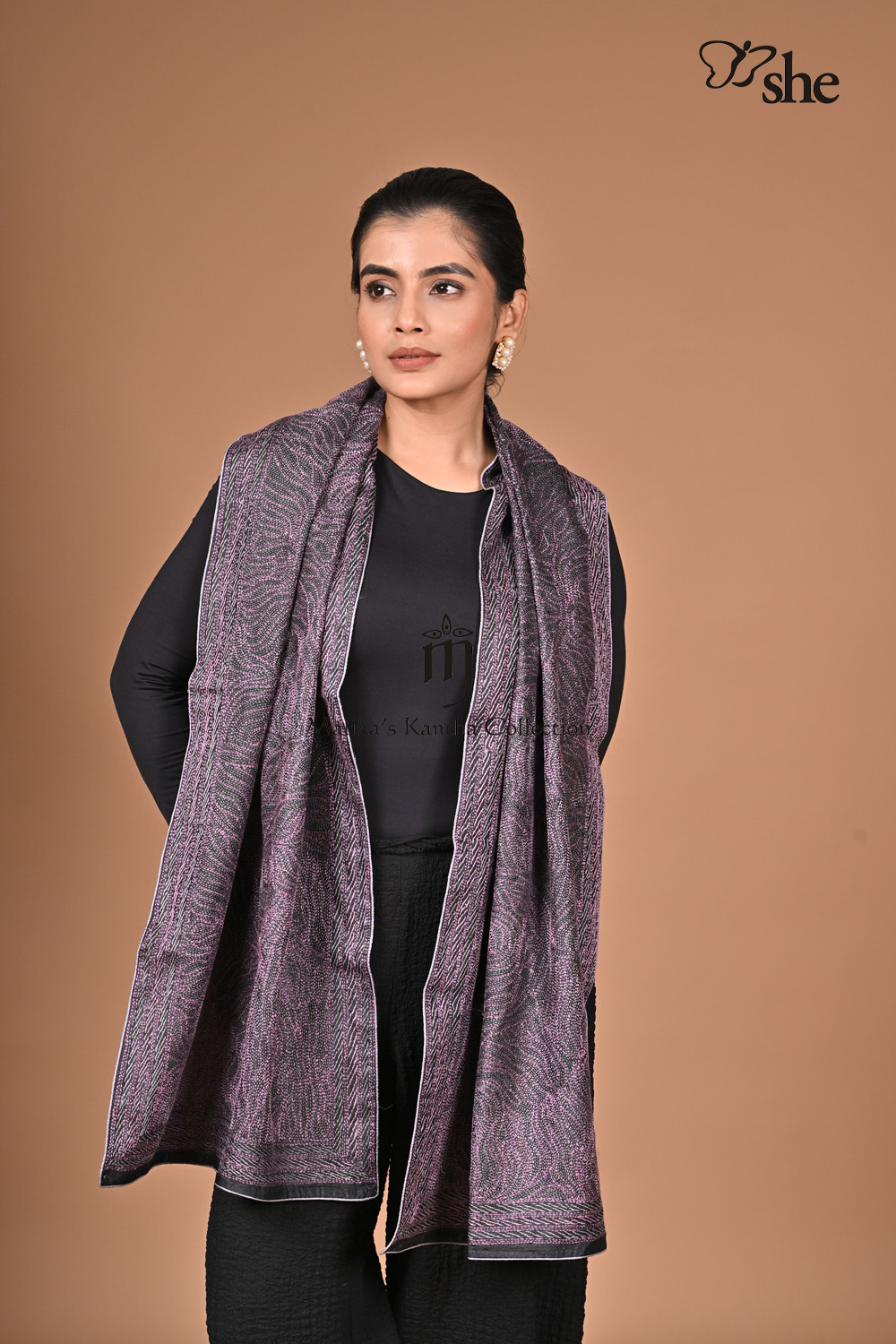 BLACK TUSSAR KANTHA EMBROIDERED SCARF WITH MAUVE & GREY ABSTRACT LINE DESIGN.