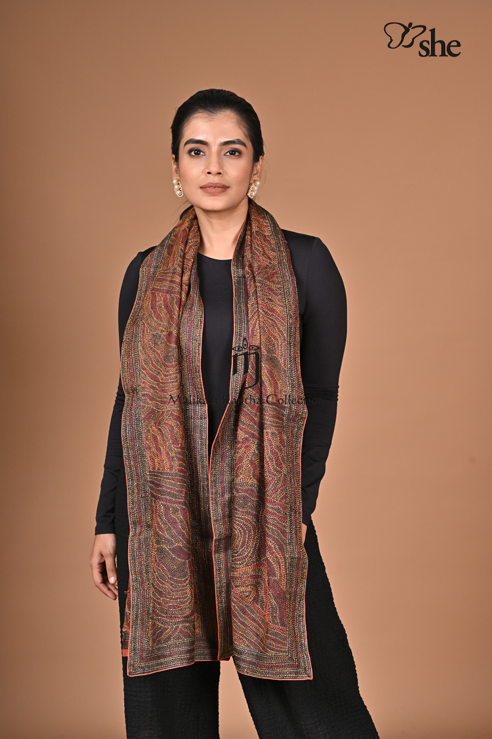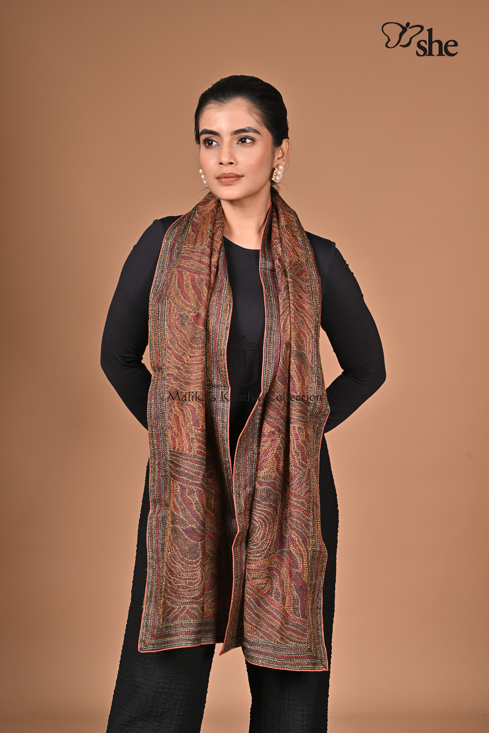 BLACK TUSSAR KANTHA EMBROIDERED SCARF WITH RUST & MUSTARD ABSTRACT LINE DESIGN.