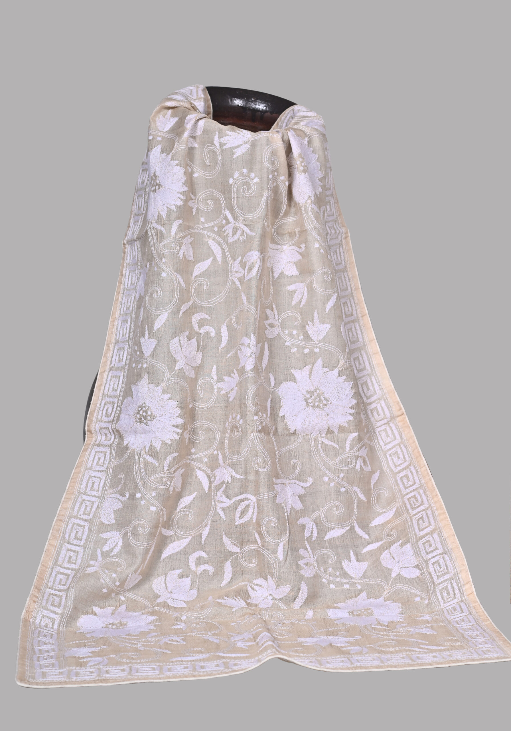 CREAM ON CREAM TUSSAR KANTHA EMBROIDERED SCARF WITH CHRYSANTHEMUM JAAL DESIGN.