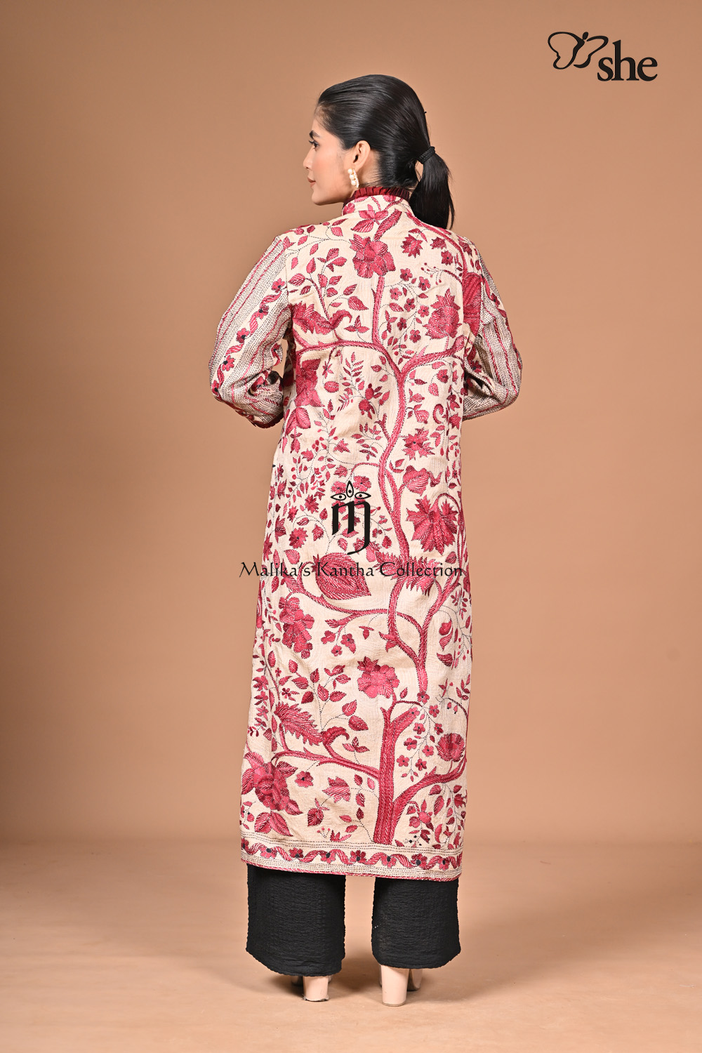 BEIGE TUSSAR KANTHA EMBROIDERED LONG PLEATED SHRUG WITH RED SHADED TREE OF LIFE DESIGN.