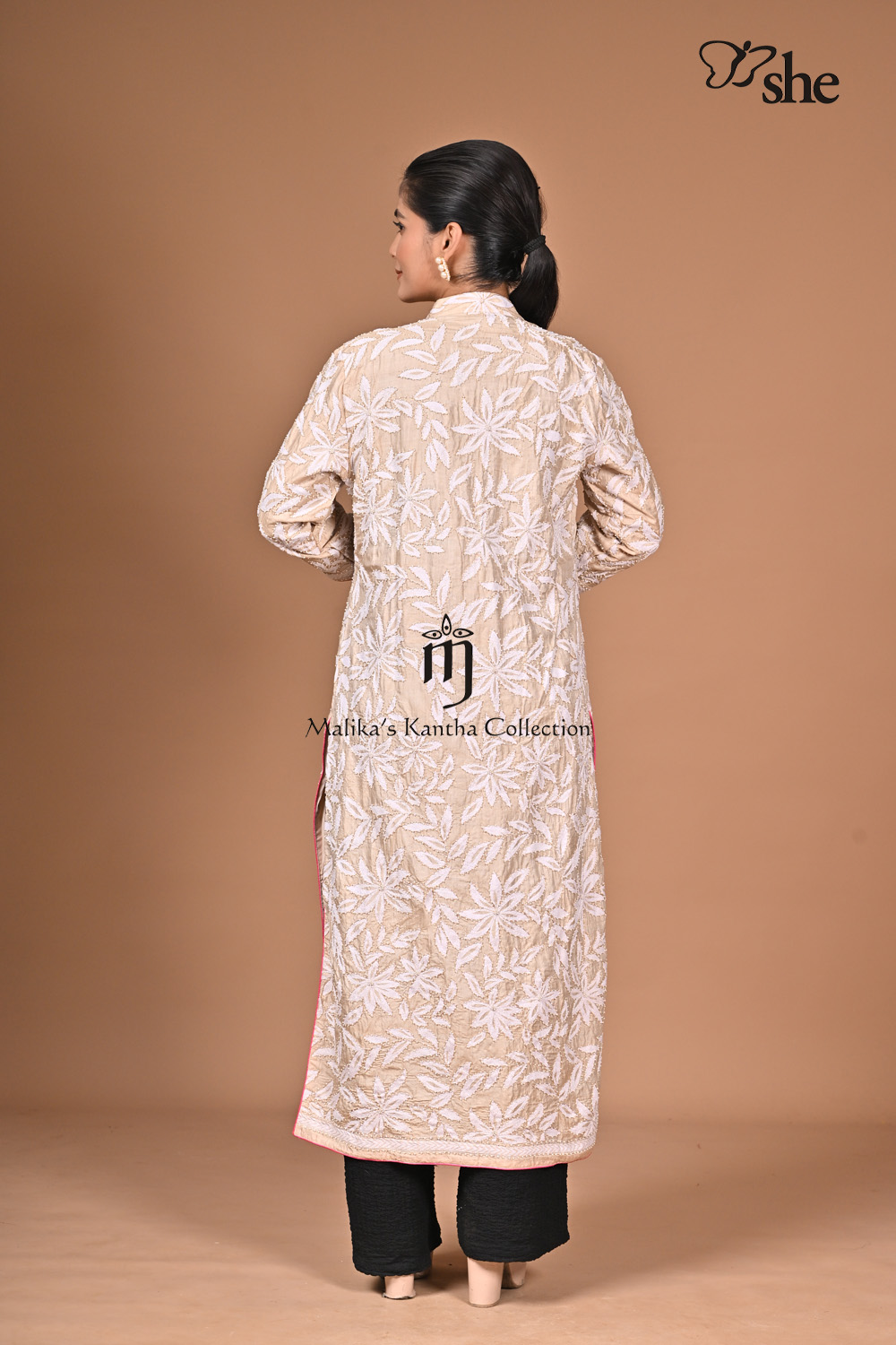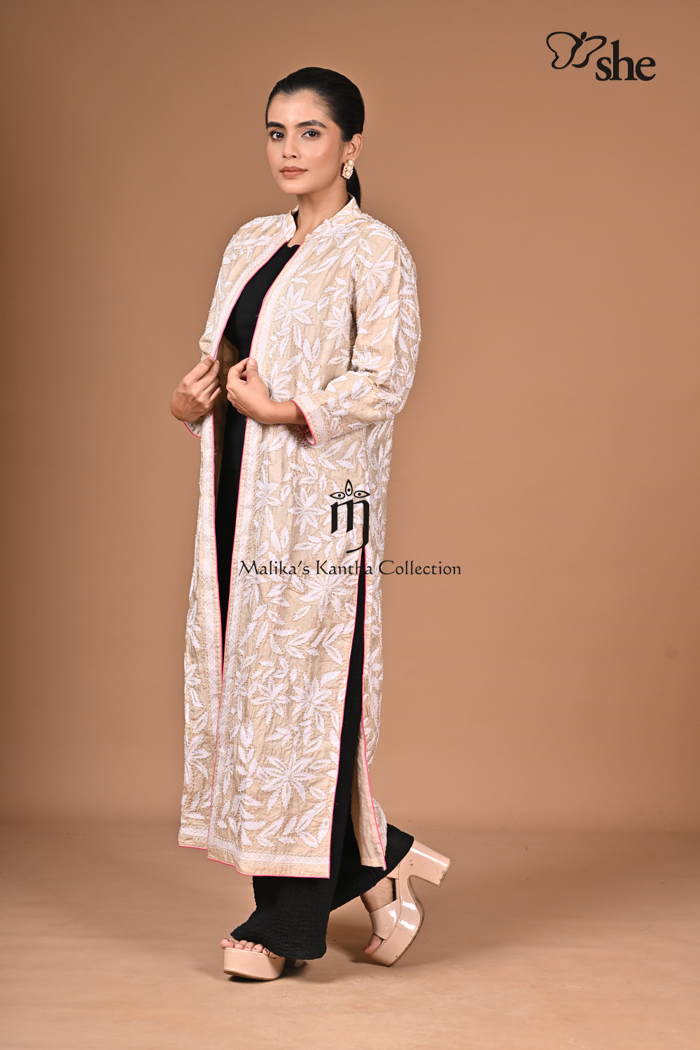 BEIGE TUSSAR KANTHA EMBROIDERED LONG SHRUG WITH CREAM FLOWER JAAL EMBELLISHED WITH BEADS.