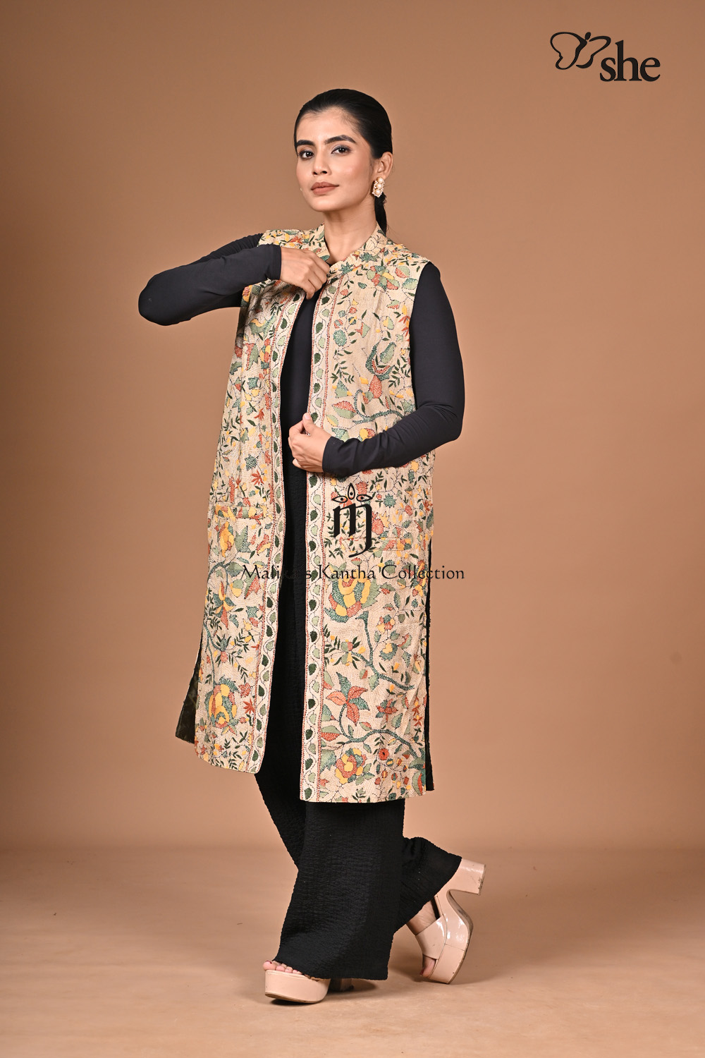 BEIGE TUSSAR KANTHA EMBROIDERED SLEEVELESS SHRUG WITH MULTICOLORED TREE OF LIFE.