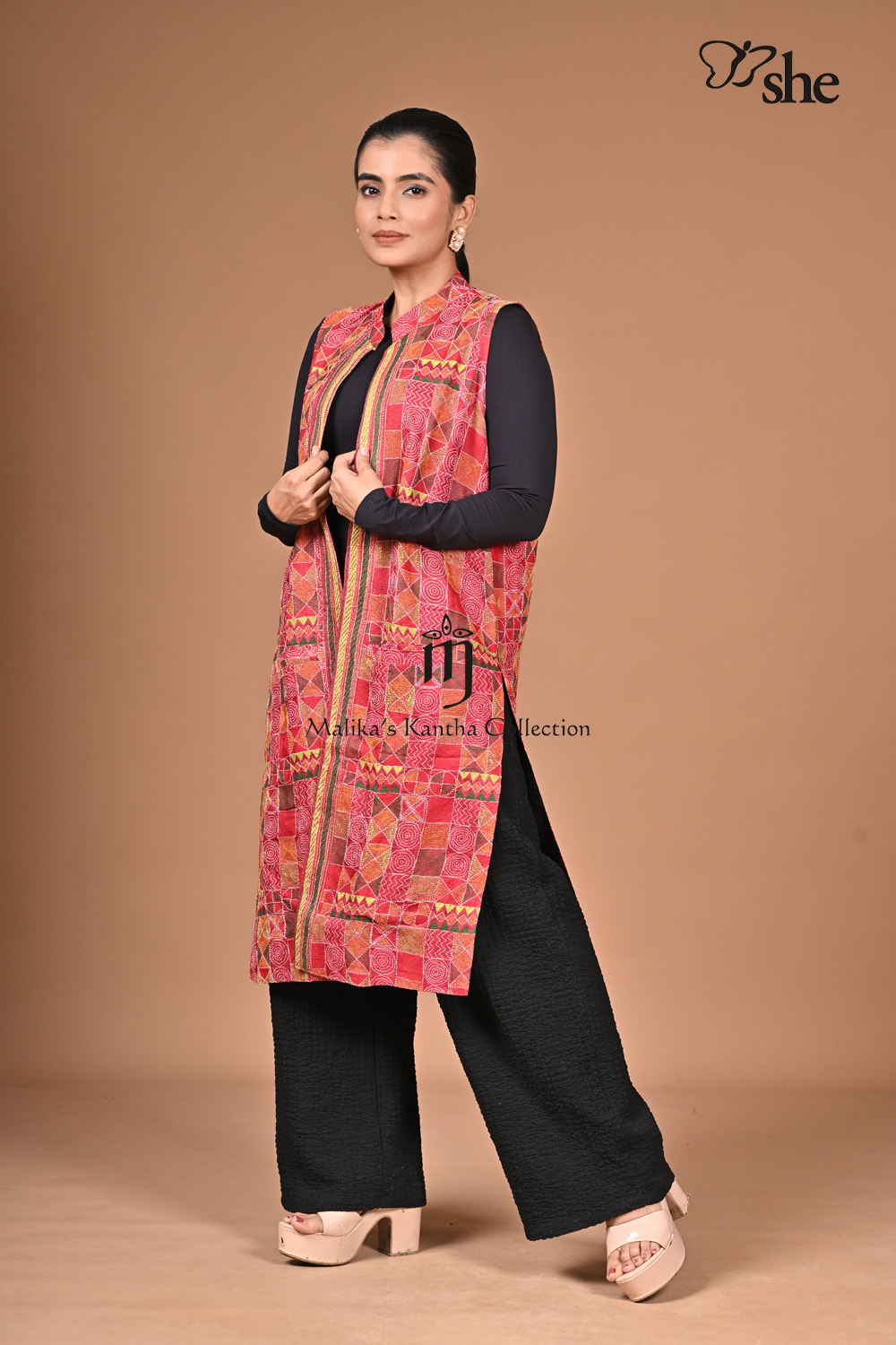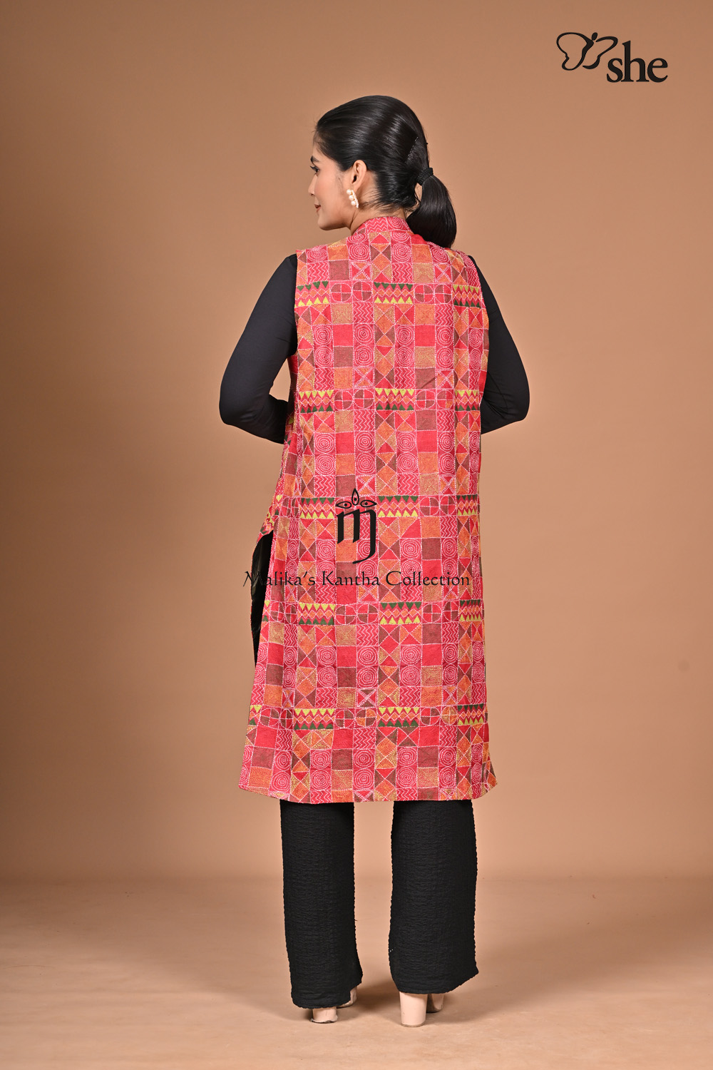 RED TUSSAR KANTHA EMBROIDERED SLEEVELESS SHRUG WITH MULTICOLORED CRAZY GEOMETRIC DESIGN.
