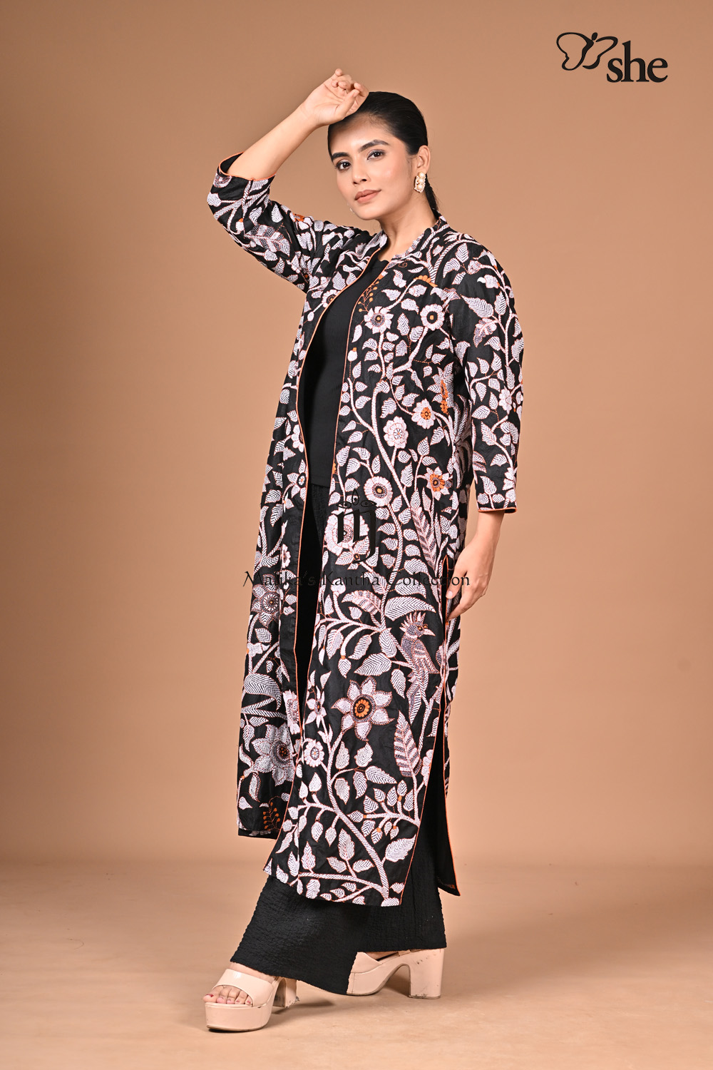 BLACK SILK KANTHA EMBROIDERED LONG SHRUG WITH PARROT DESIGN.