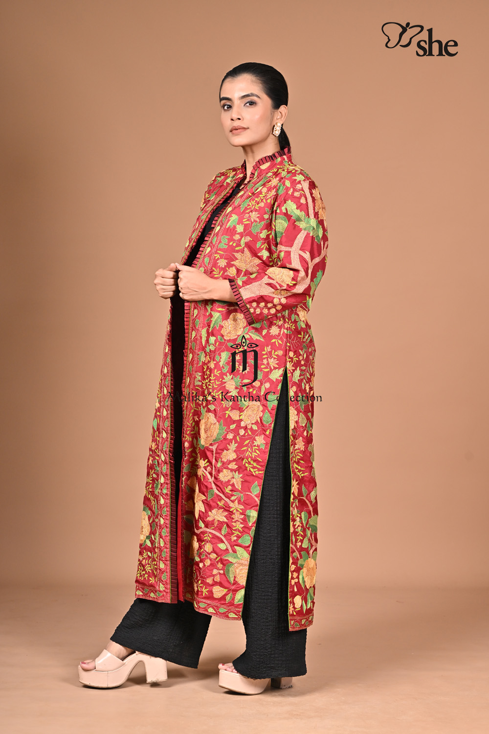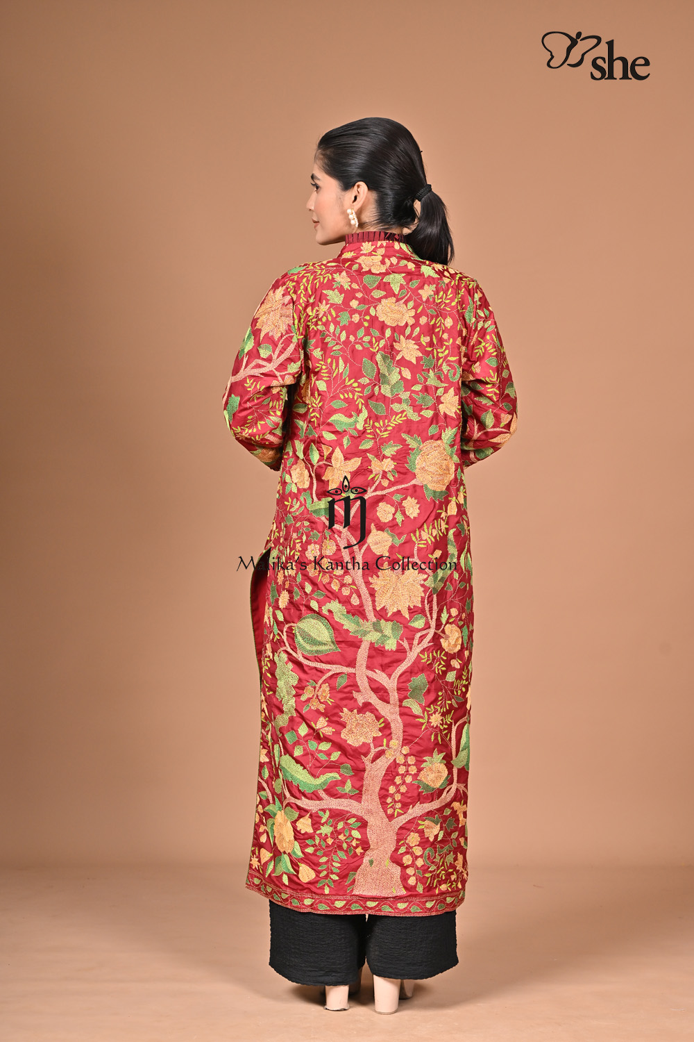 MAROON SILK KANTHA EMBROIDERED LONG PLEATED SHRUG WITH TREE OF LIFE.