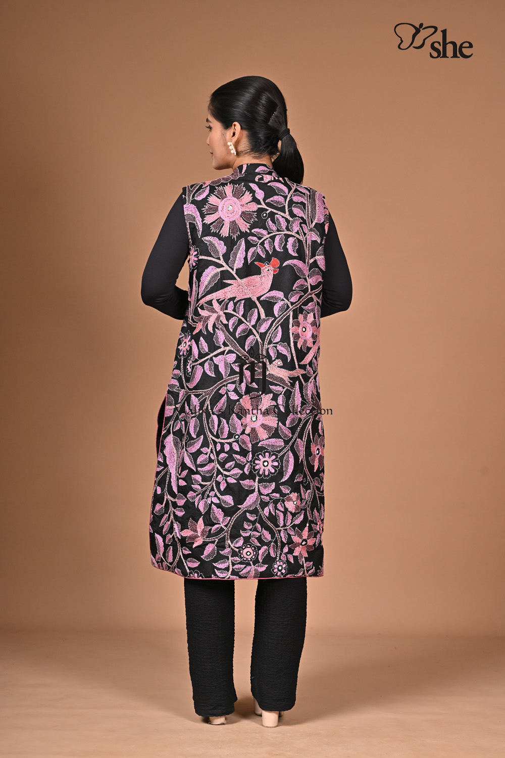 BLACK SILK KANTHA EMBROIDERED SLEEVELESS SHRUG WITH PINK & MAUVE PARROT & FLORAL DESIGN.