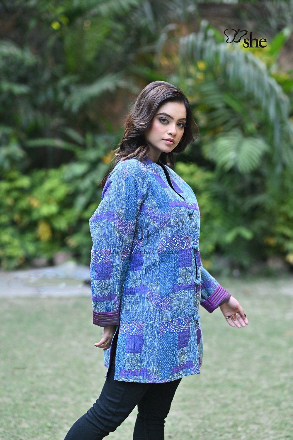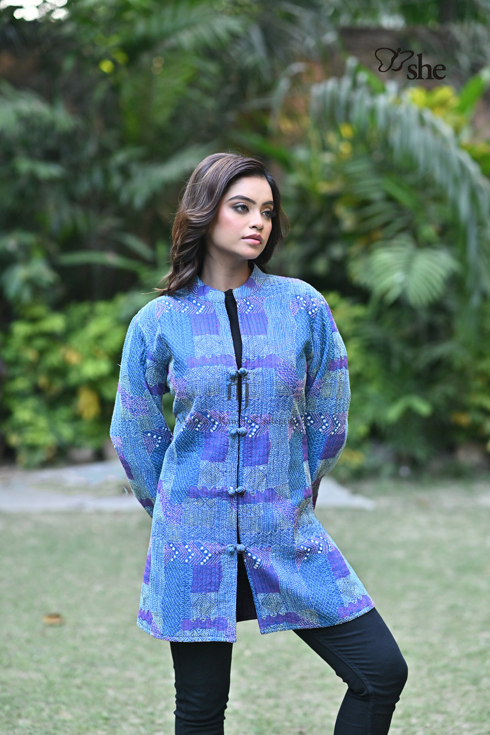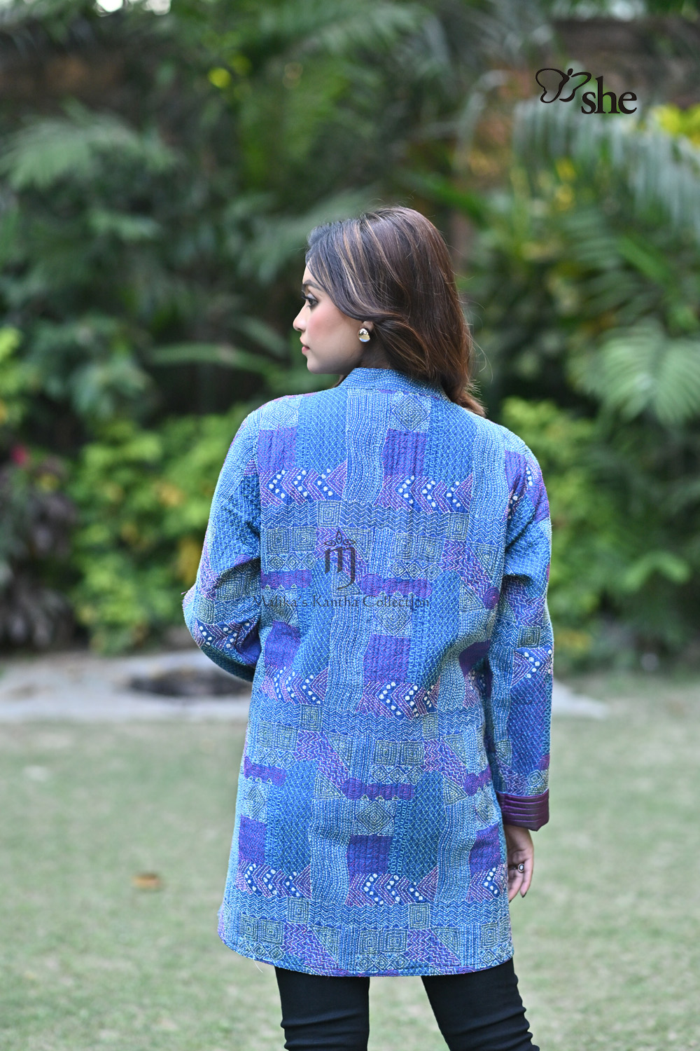 BLUE TUSSAR KANTHA EMBROIDERED QUILTED SHRUG WITH CRAZY GEOMETRIC DESIGN.