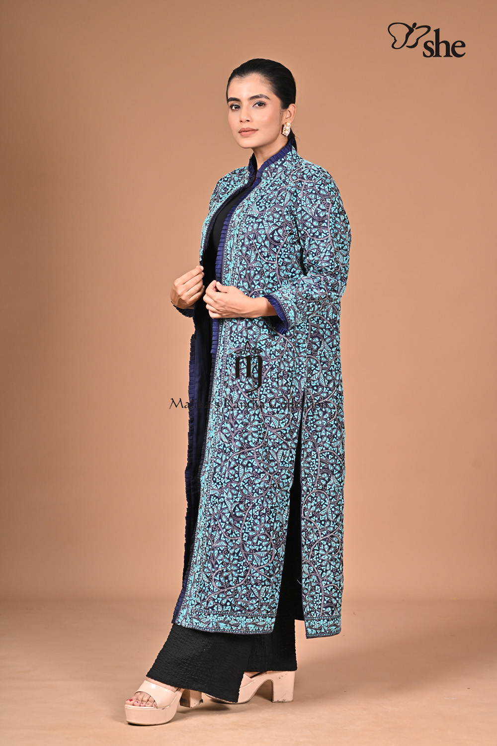 BLUE SILK KANTHA EMBROIDERED LONG PLEADED SHRUG WITH TURQUOISE HEAVY JAAL.