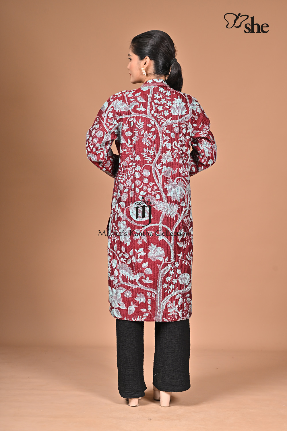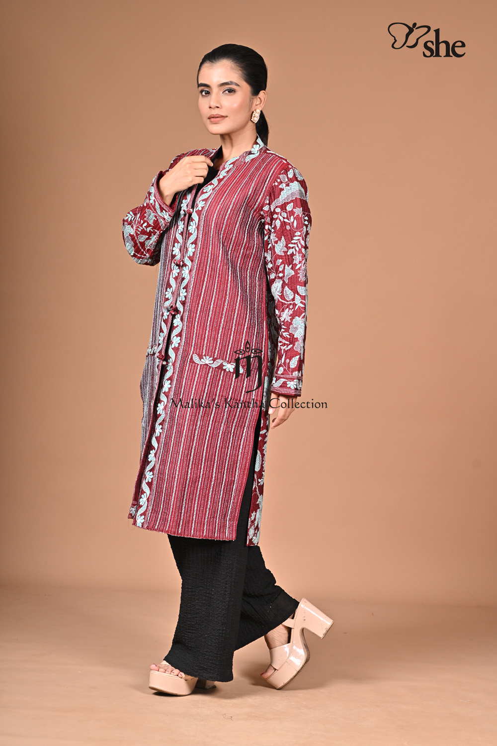 MAROON SILK KANTHA EMBROIDERED PLEATED SHRUG WITH TREE OF LIFE DESIGN.