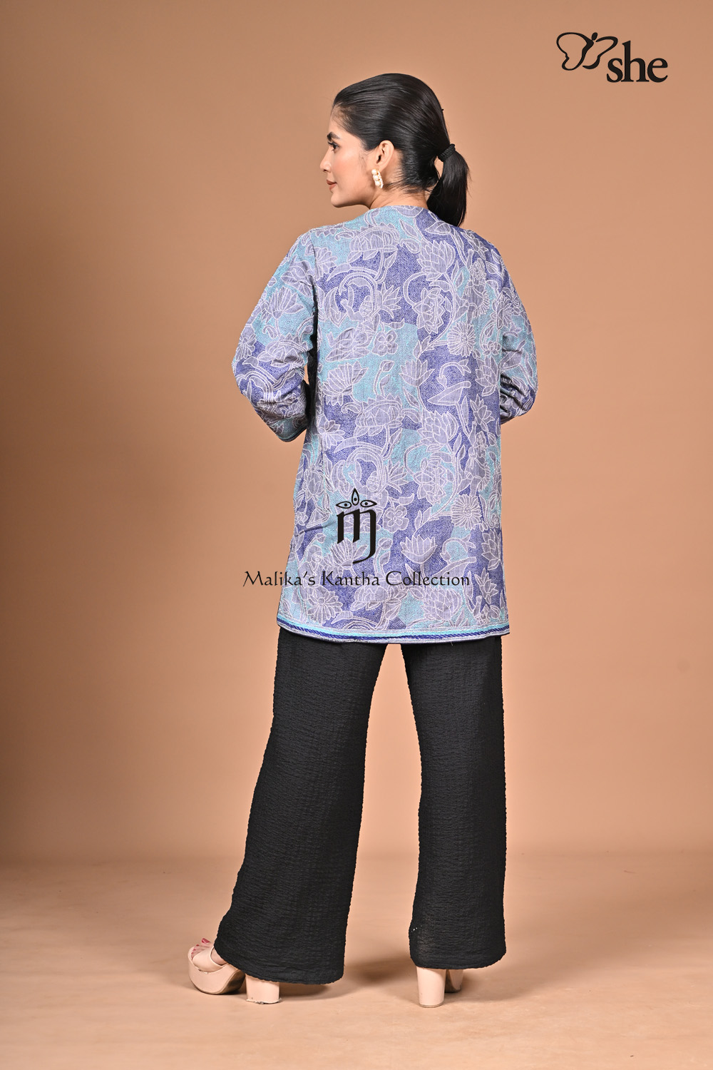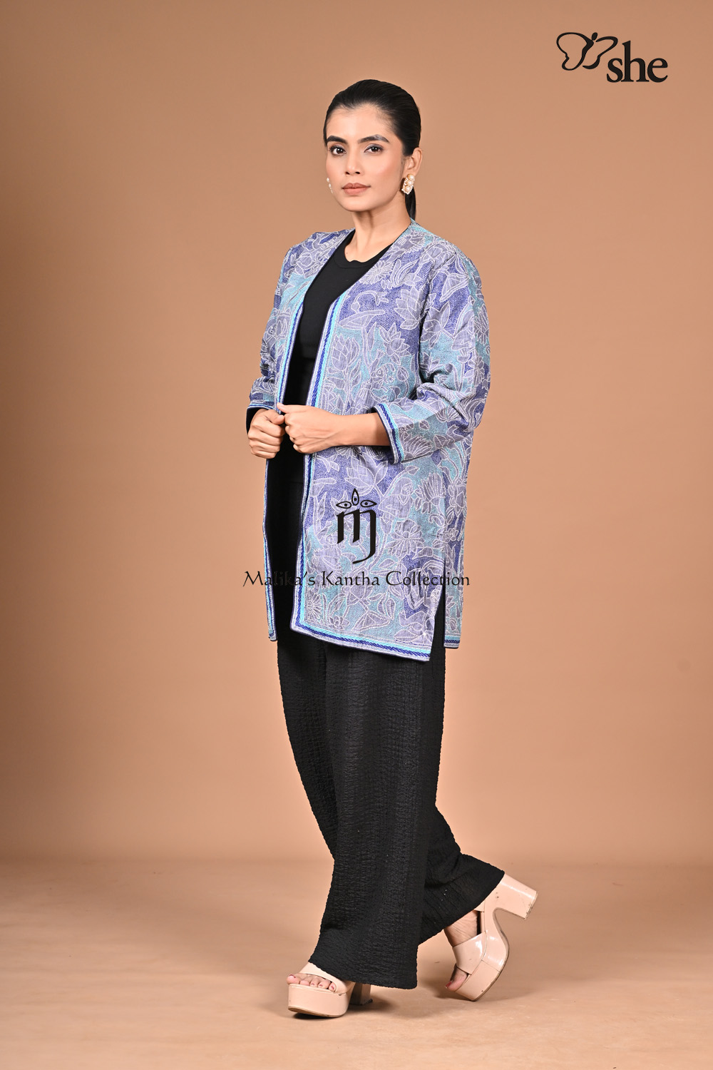 GREY TUSSAR KANTHA EMBROIDERED SHRUG WITH FLORAL RELIEF DESIGN.