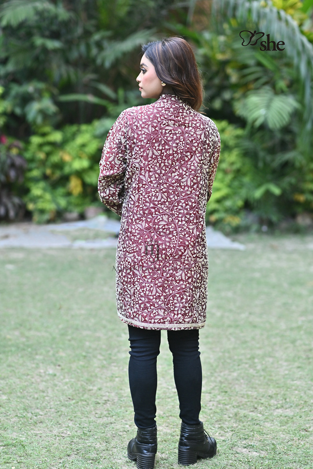MAROON SILK KANTHA EMBROIDERED QUILTED SHRUG WITH HEAVY JAAL DESIGN.