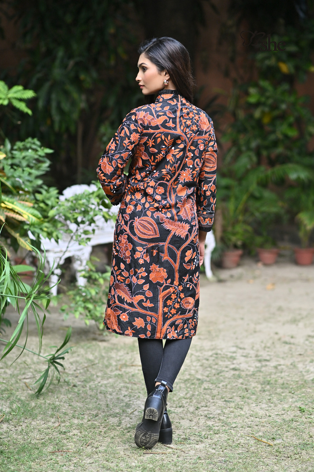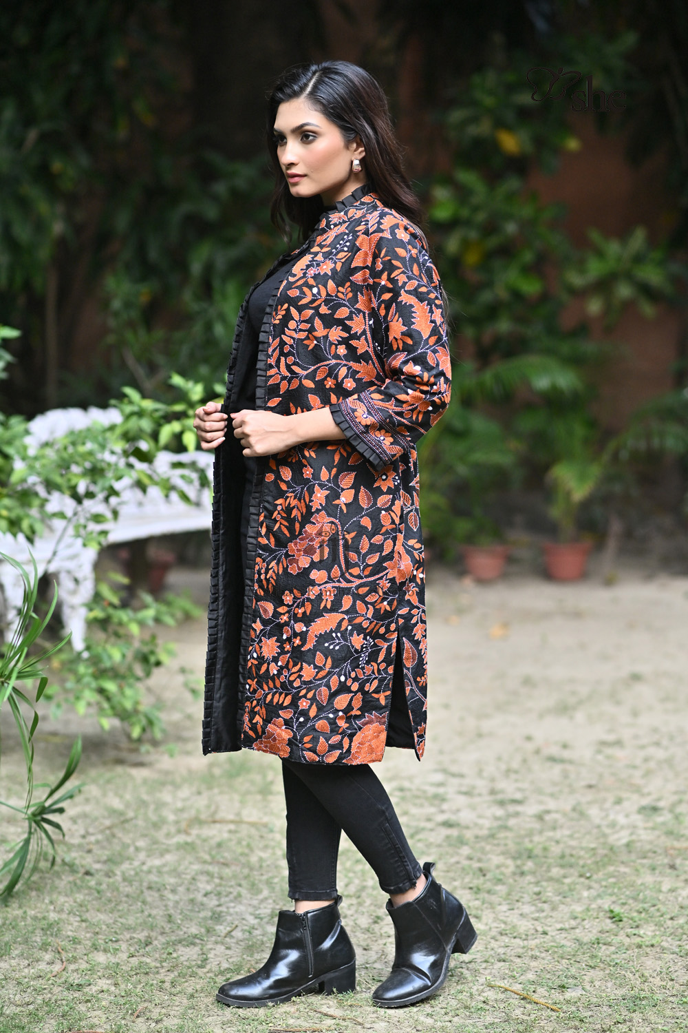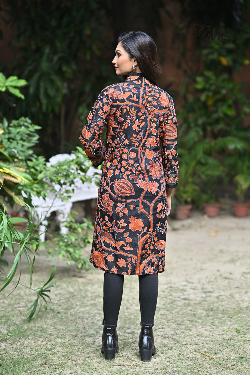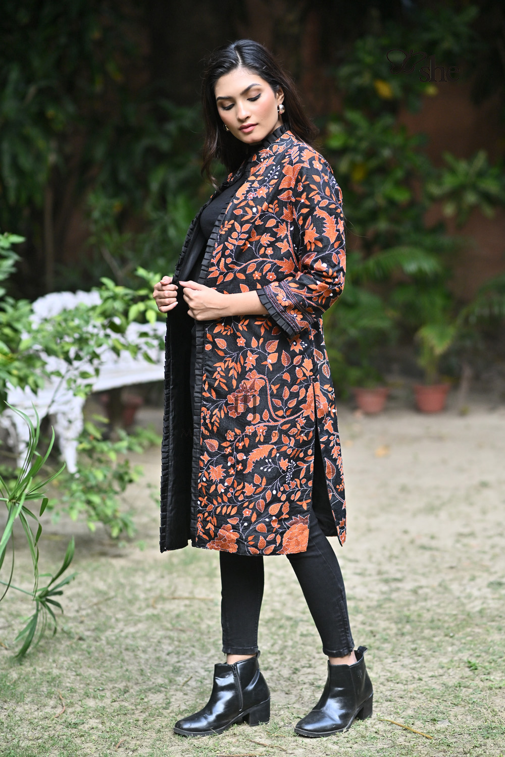 BLACK SILK KANTHA EMBROIDERED PLEATED SHRUG WITH TREE OF LIFE DESIGN.