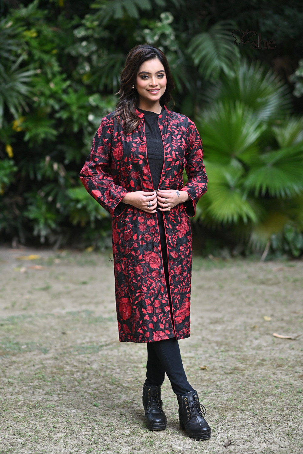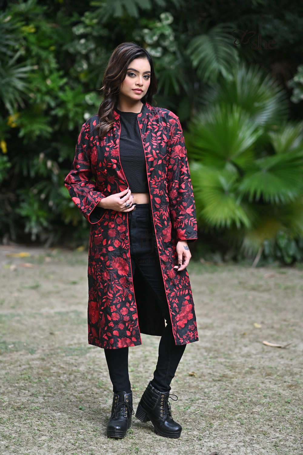 BLACK SILK KANTHA EMBROIDERED SHRUG WITH RED TREE OF LIFE DESIGN.