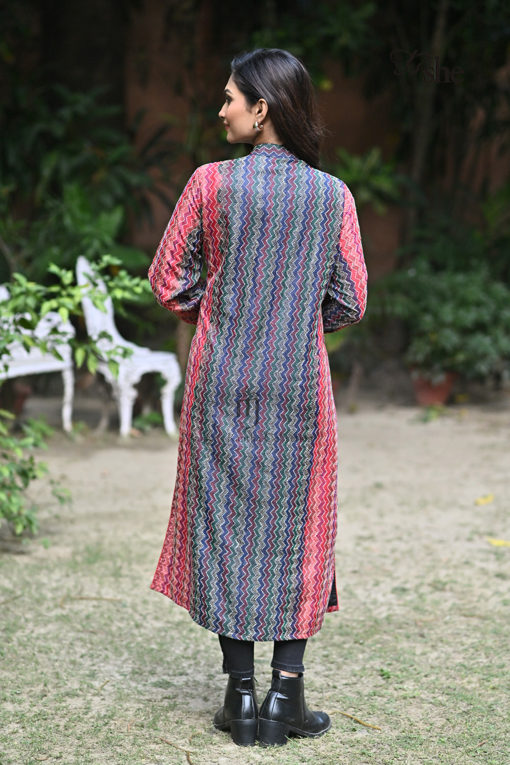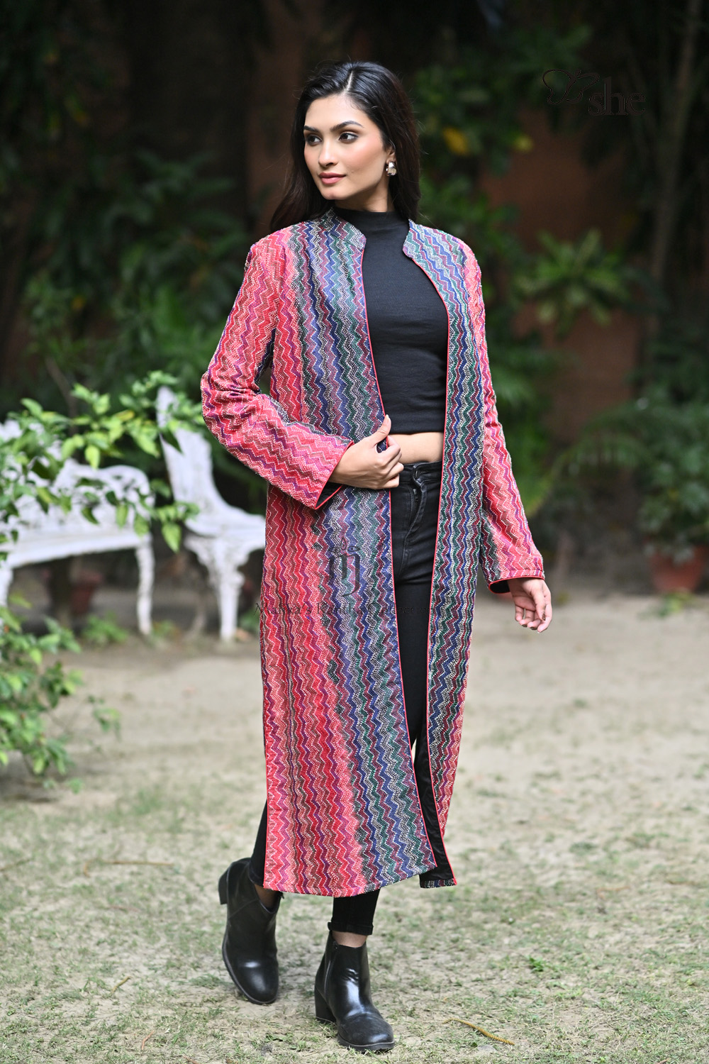 RED & BLACK TUSSAR KANTHA EMBROIDERED SHRUG WITH MULTICOLOR ZIG ZAG DESIGN.