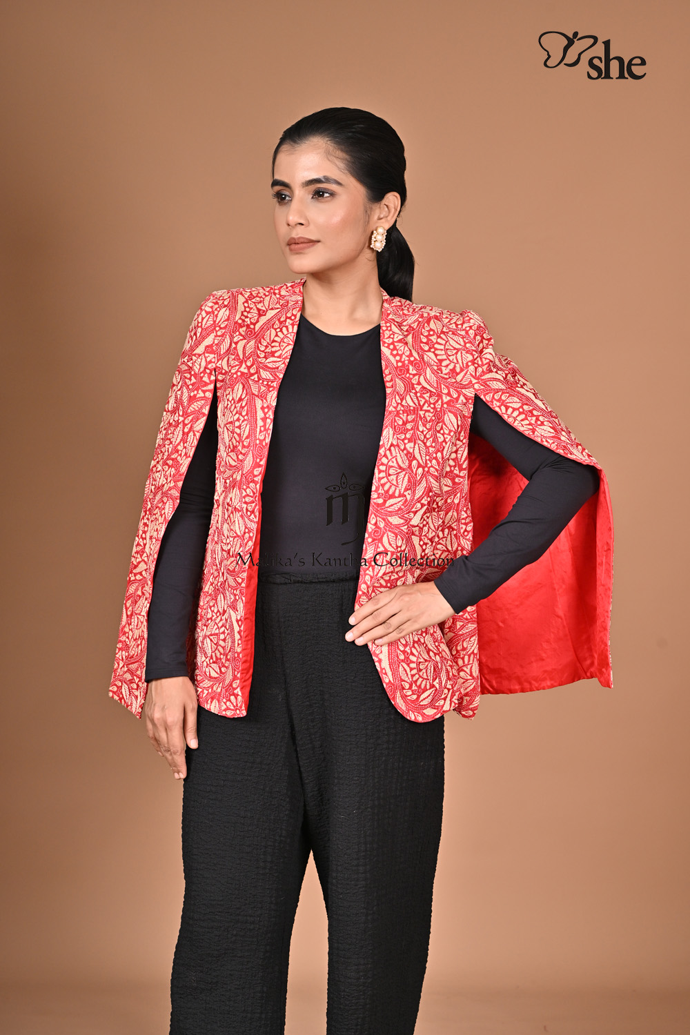 RED SILK KANTHA EMBROIDERED SHRUG WITH HRAVY JAAL DESIGN.