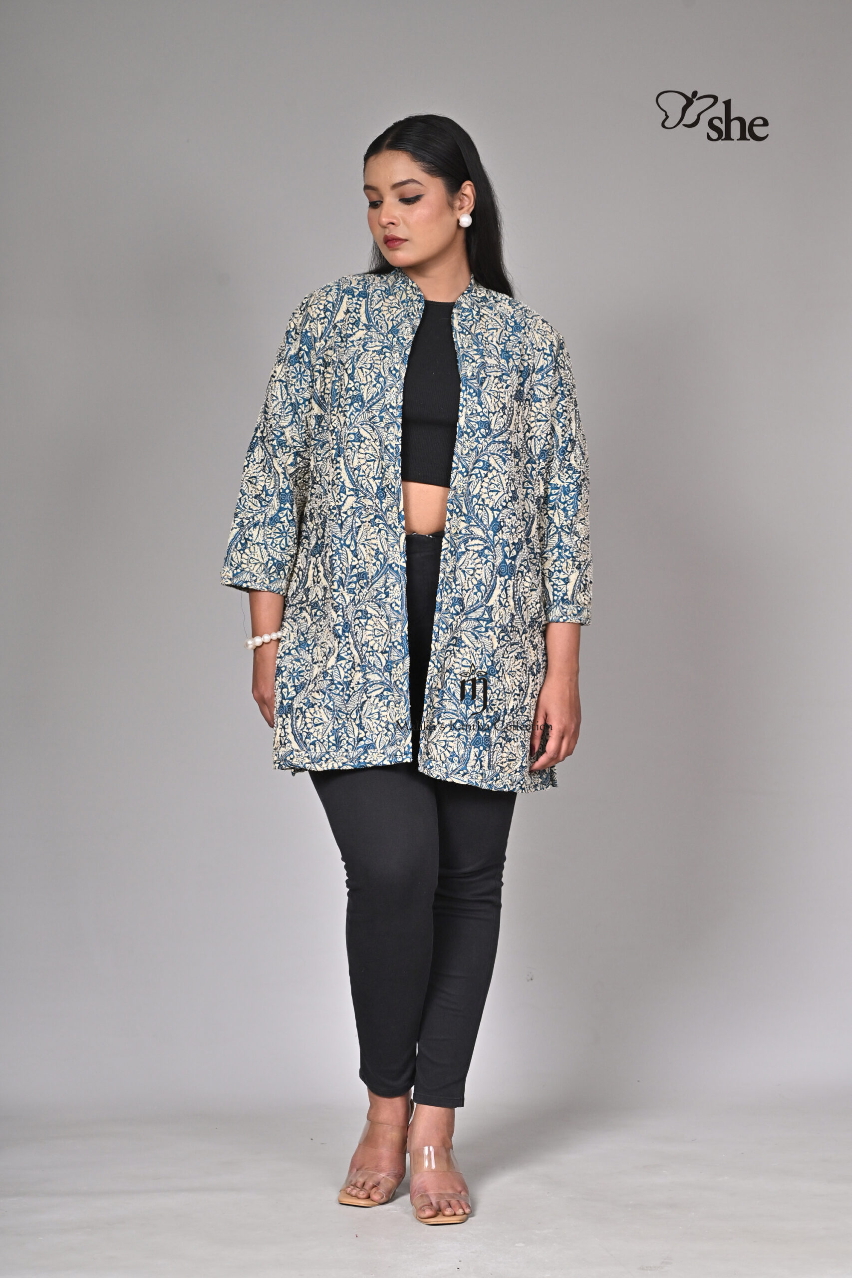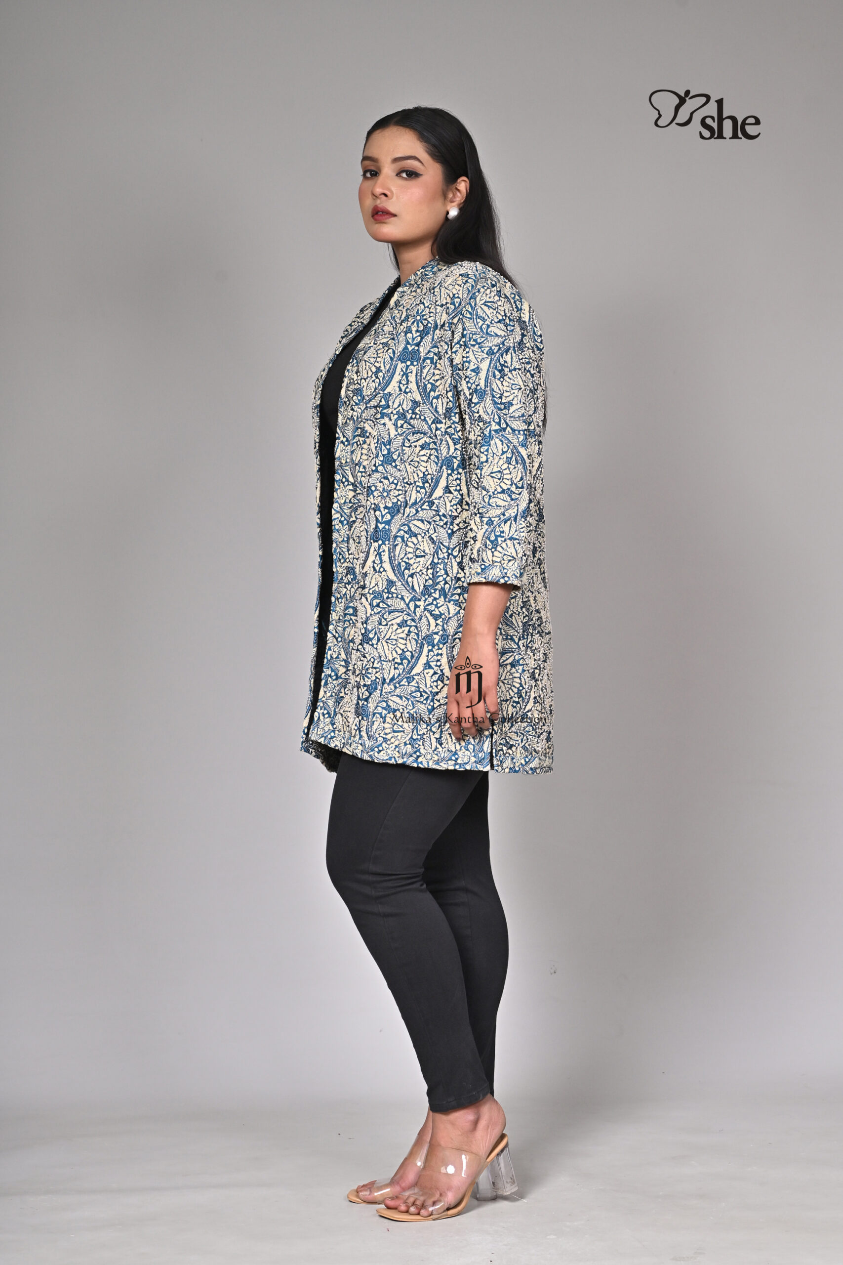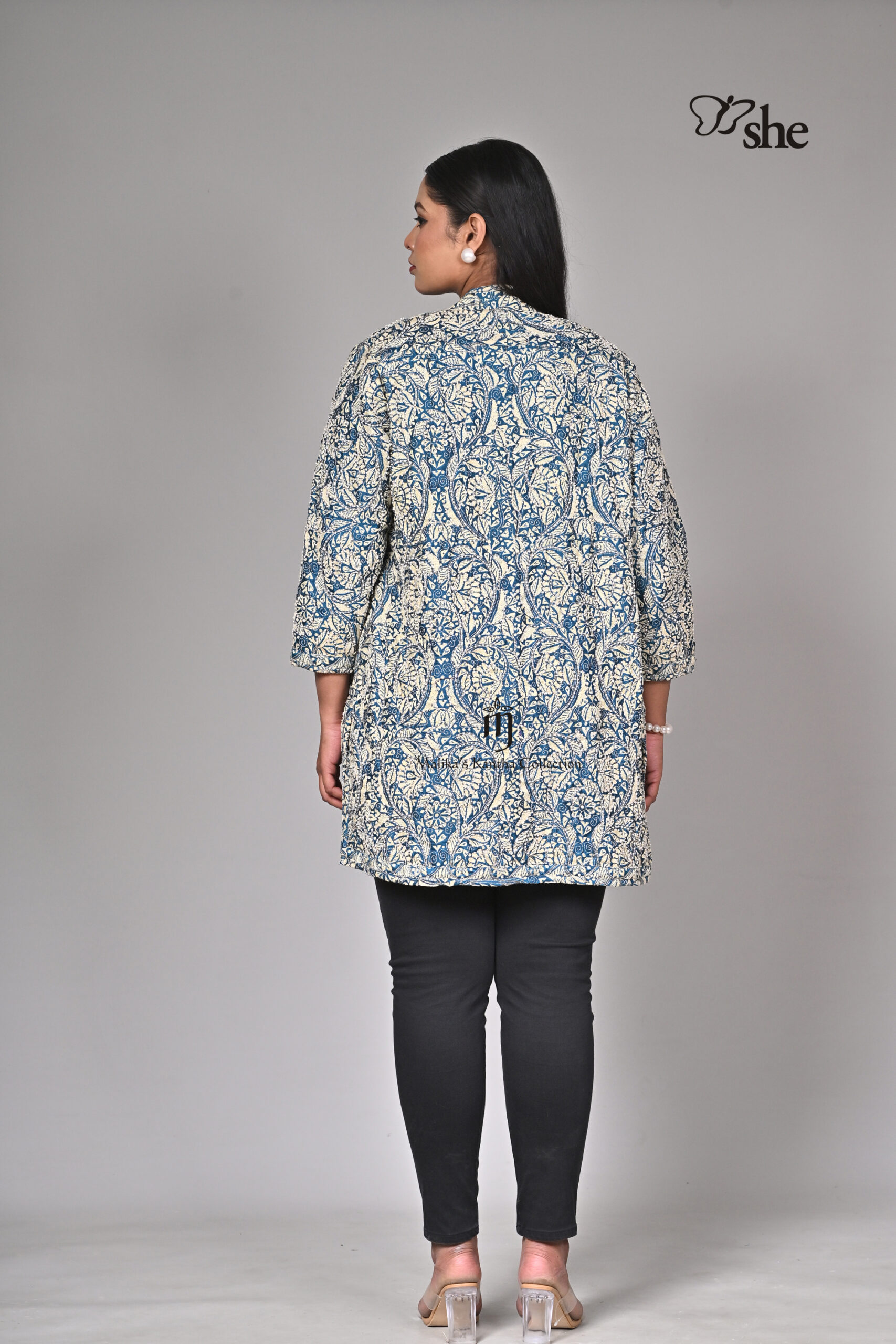 BLUE SILK KANTHA EMBROIDERED AND BEADED HEAVY JAAL SHRUG.