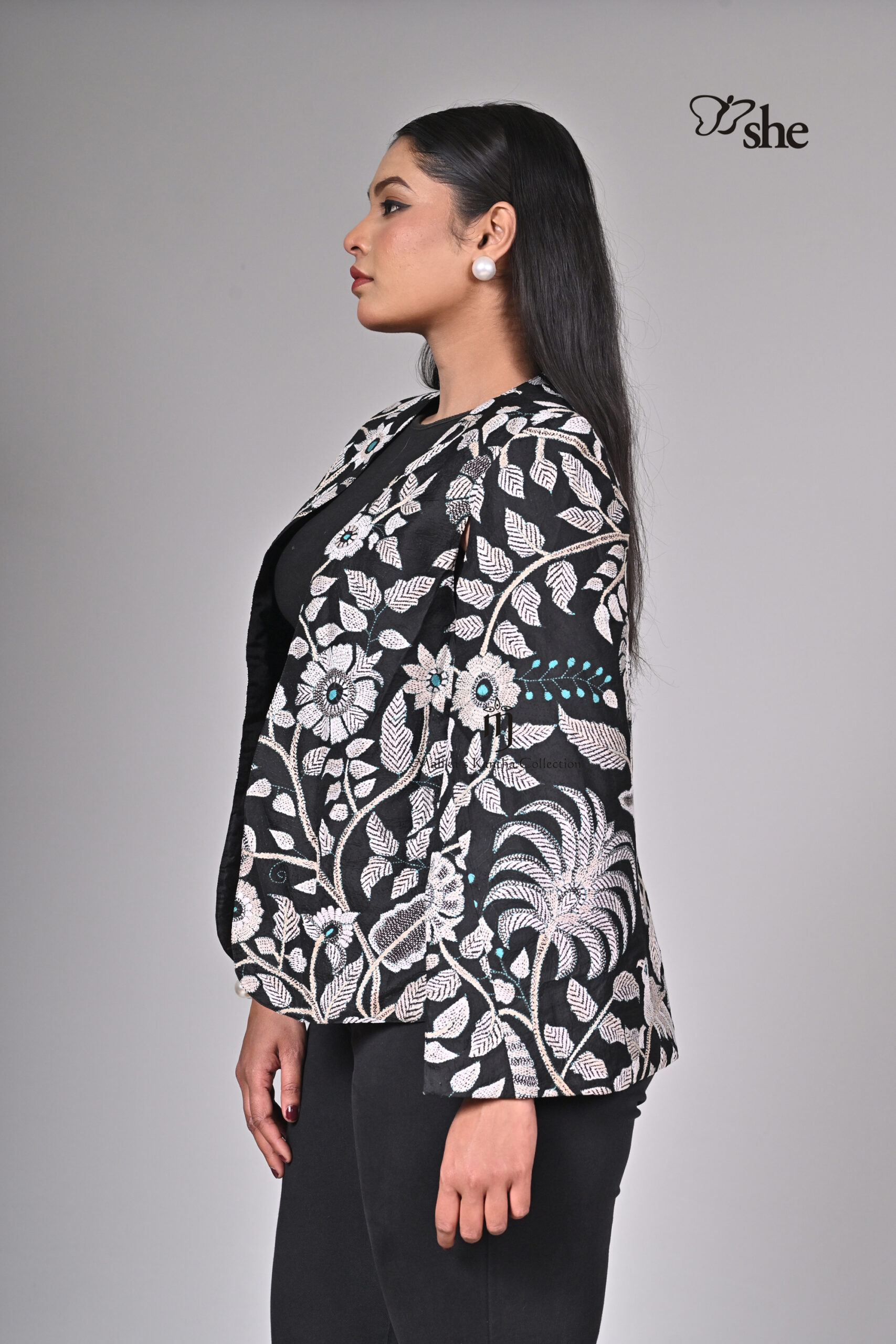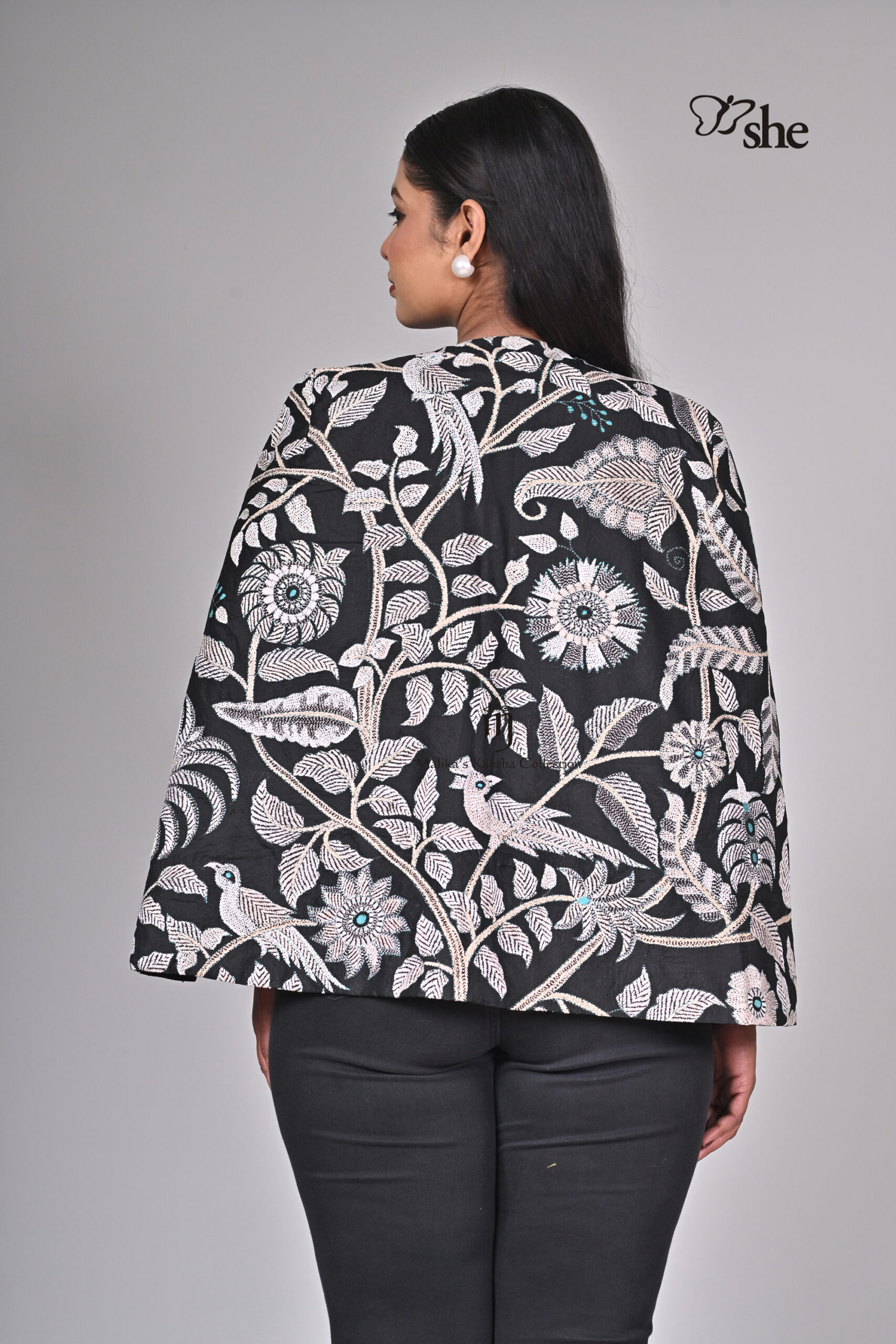 BLACK SILK KANTHA EMBROIDERED PARROT CAPE SHRUG DESIGN.
