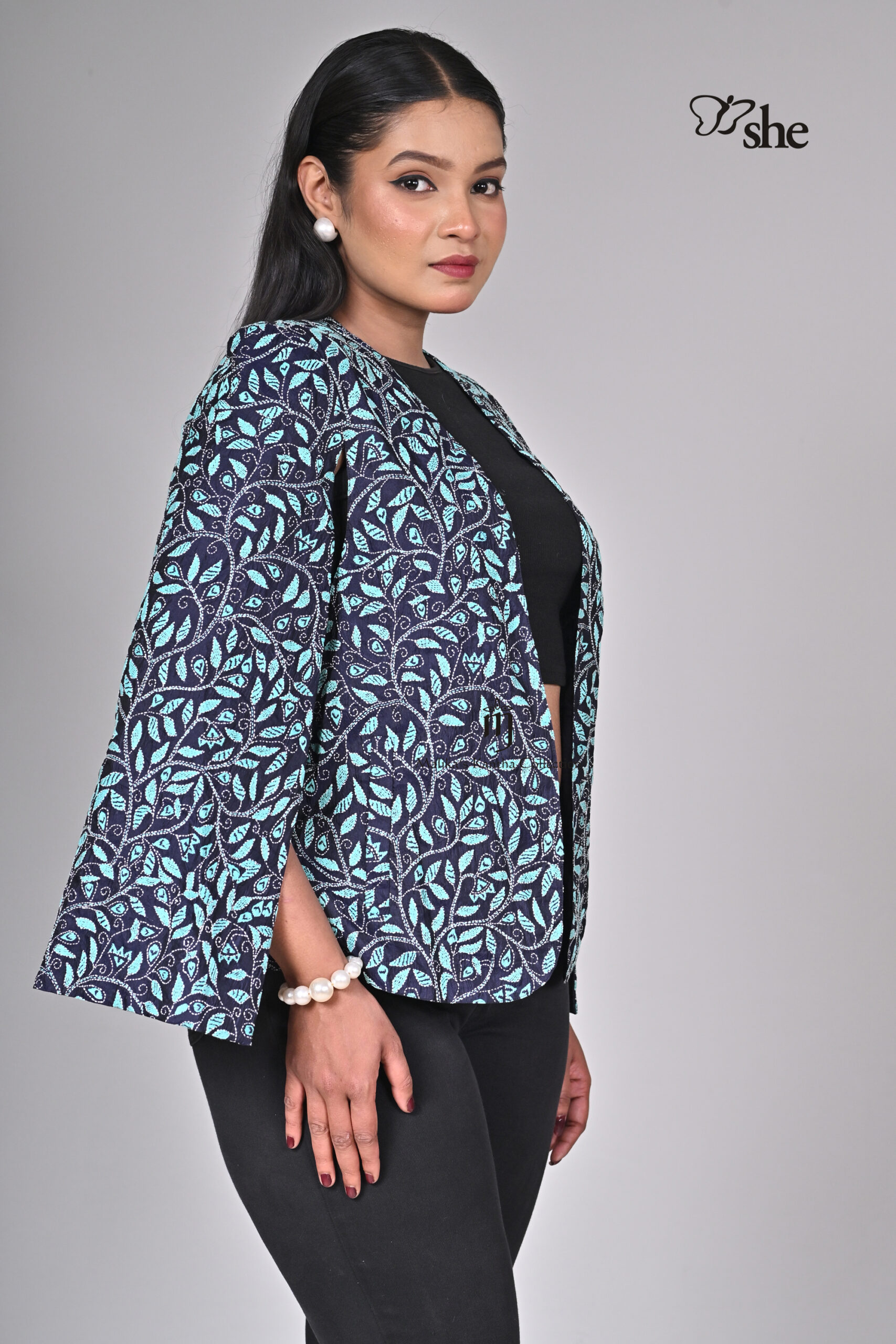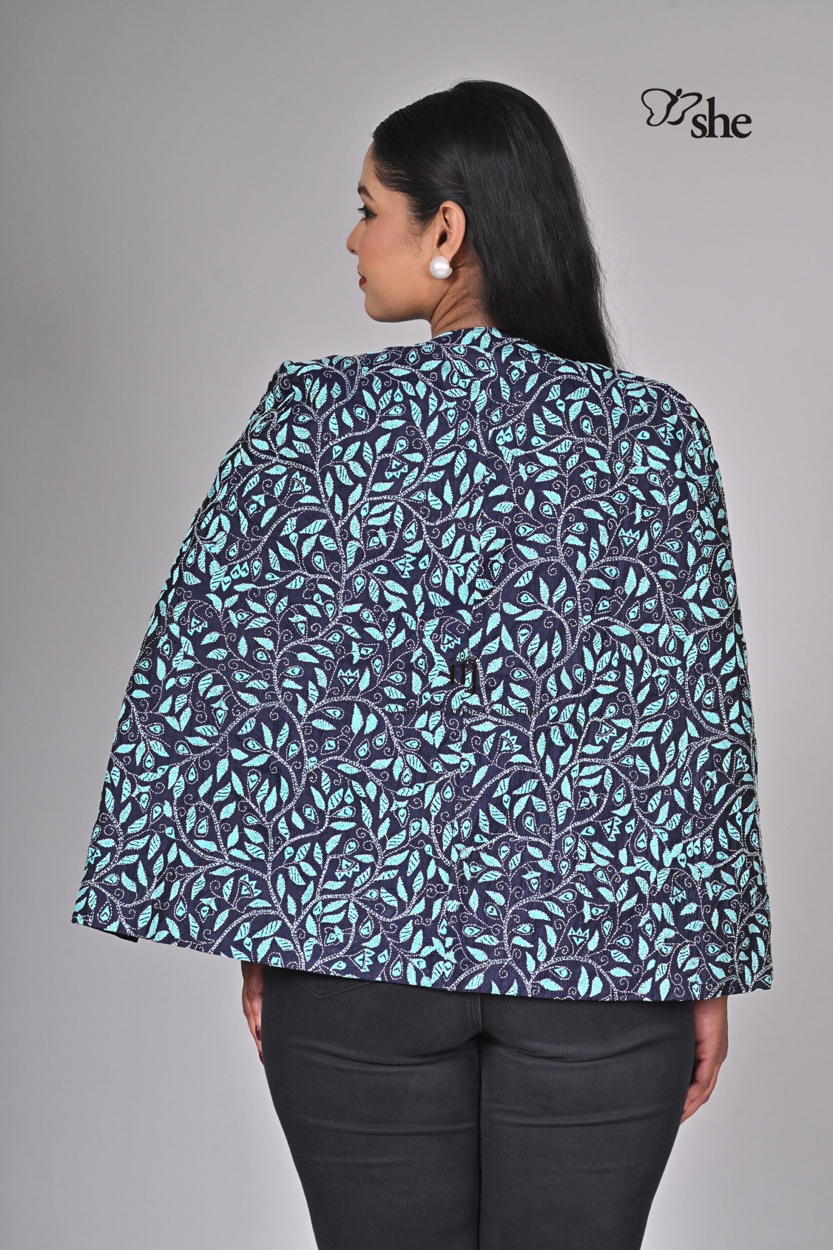 BLUE SILK KANTHA EMBROIDERED TURQ HEAVY JAAL CAPE SHRUG DESIGN.